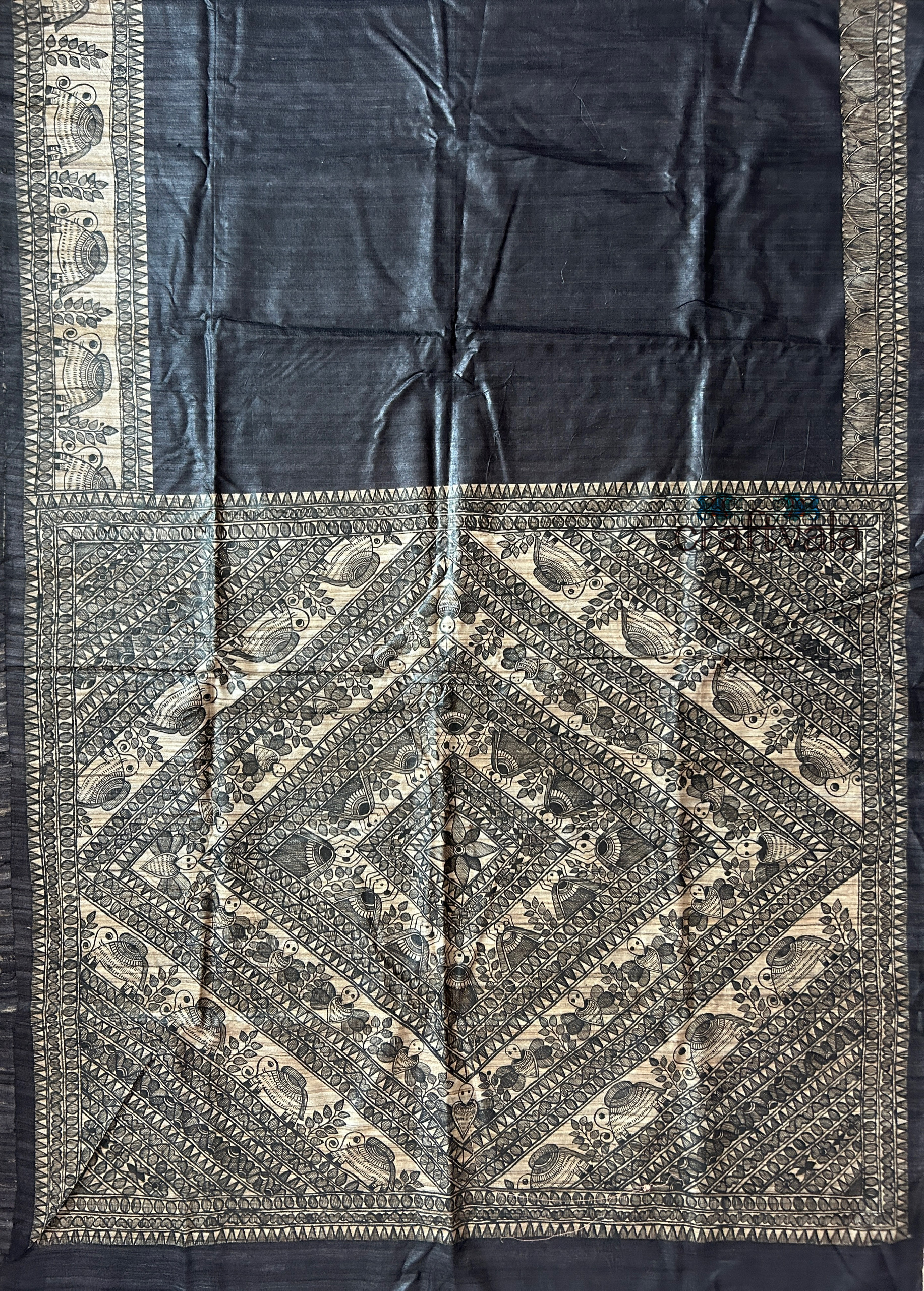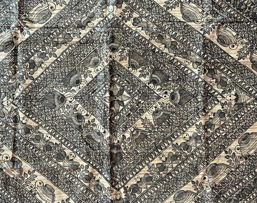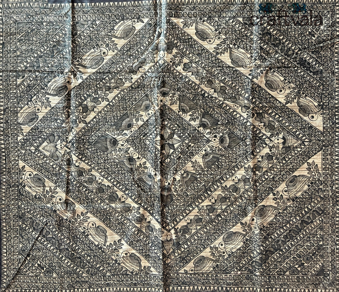 Handwoven Madhubani Tasar Ghicha Silk Saree With Hand-Painted Taraditional Godna Style of Madhubani Painting.