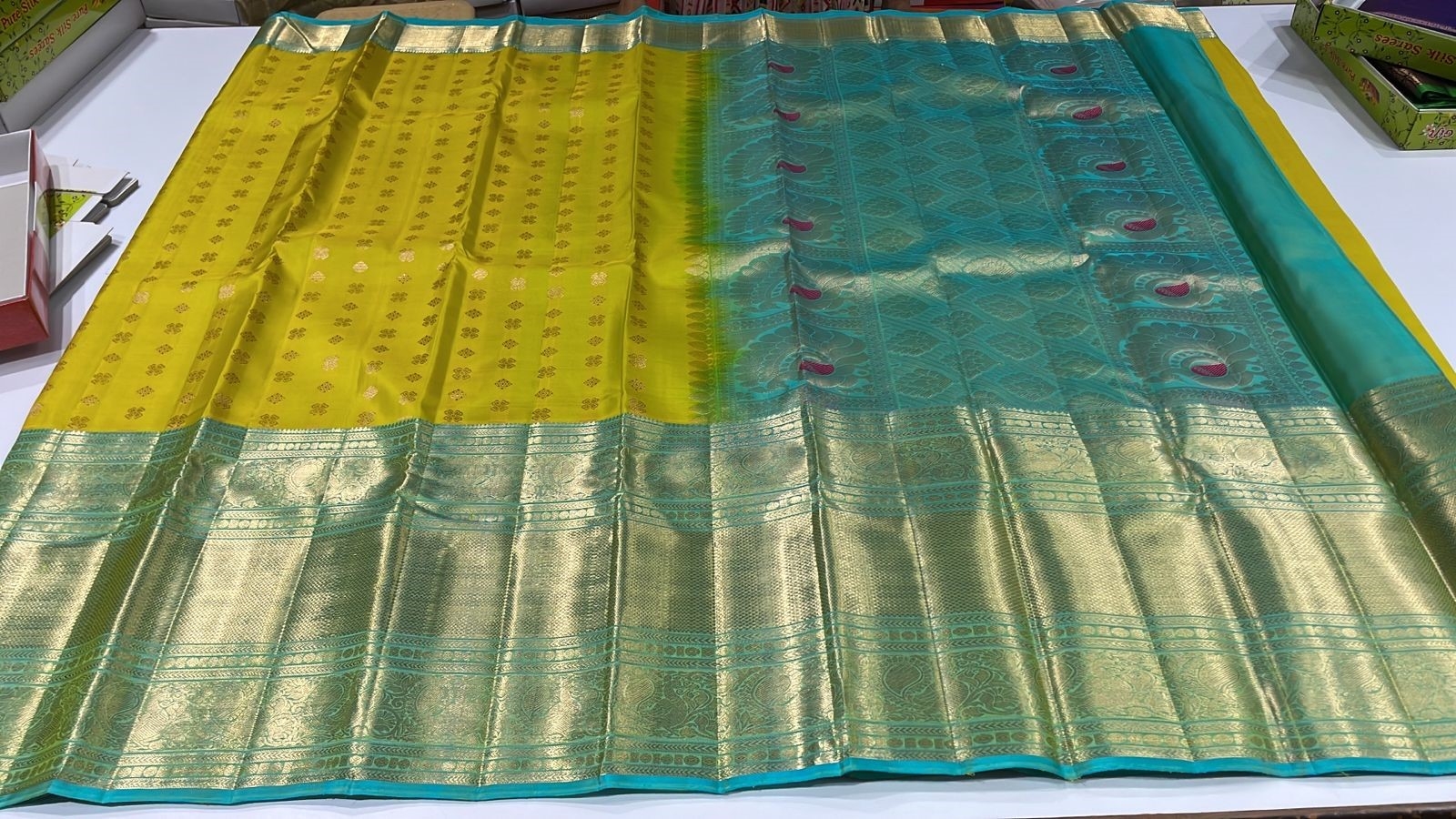 The saree features double-warp weaving, ensuring durability and a smooth finish. Crafted with pure silk warp and viscose weft, it radiates a soft, luxurious feel. Its striking yellow colour is complemented by a rich green border, making it a statement piece perfect for weddings and other special occasions.