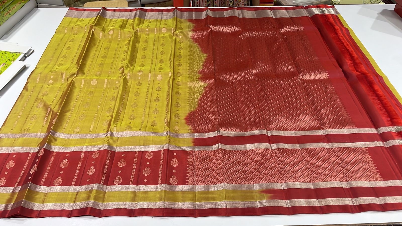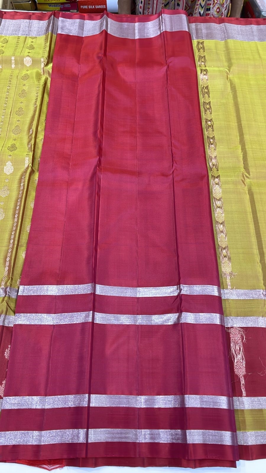 This saree stands out for its double-warp weaving style, a hallmark of fine craftsmanship. Made with pure silk warp and viscose weft, it offers a perfect blend of softness, sheen and durability. The Kanchi border adds a regal touch, reflecting the rich heritage of South Indian textiles.