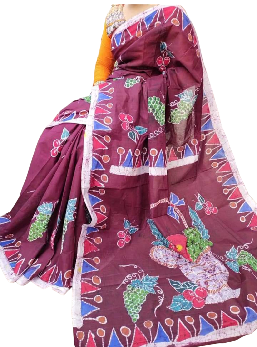 This saree features the delicate batik art of Bengal, with each design hand-crafted by skilled artisans. With a length of 5.5 meters and an 80 cm matching blouse piece, it drapes beautifully and exudes timeless elegance. The striking purple shade adds a regal touch, making it a standout piece in your collection.