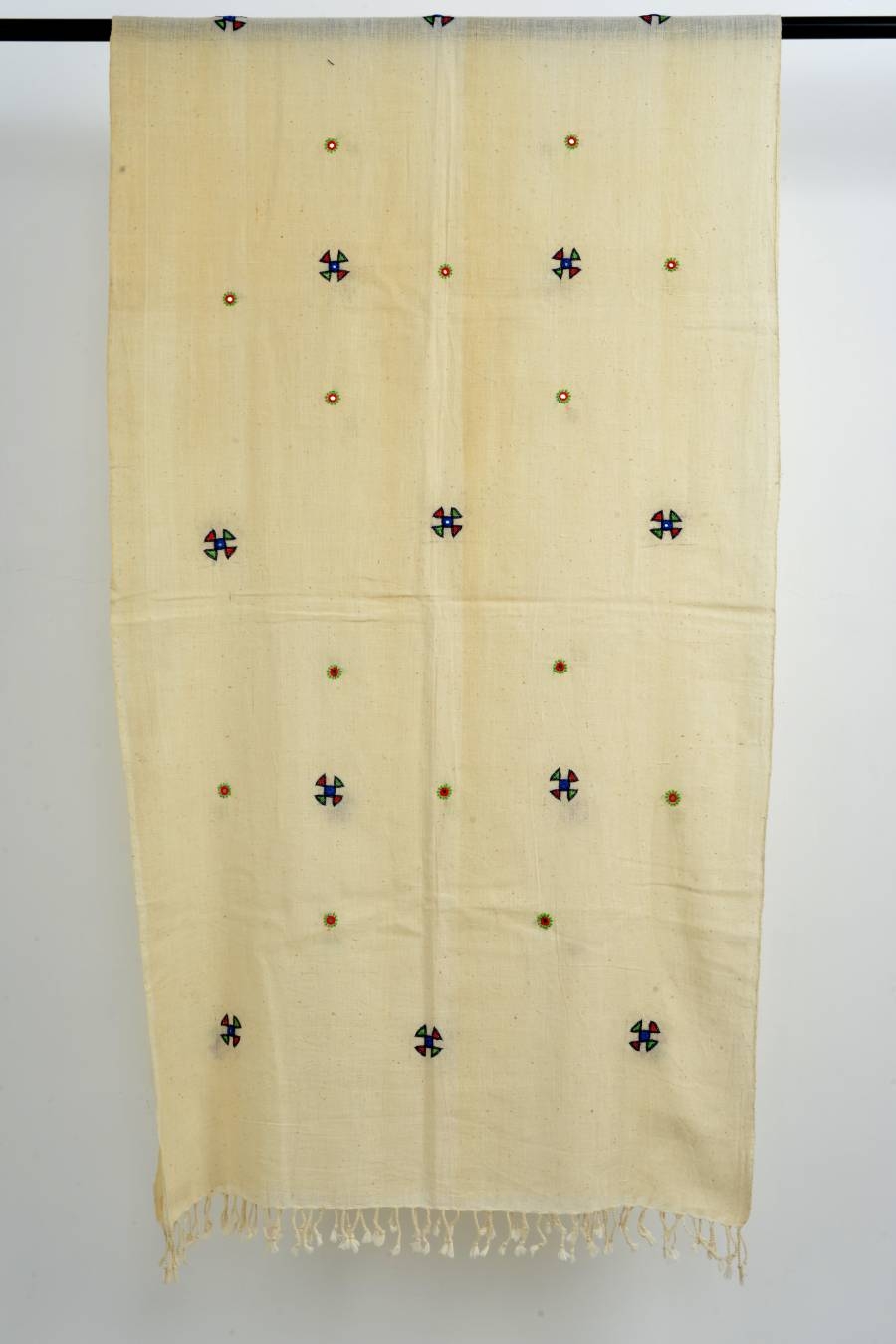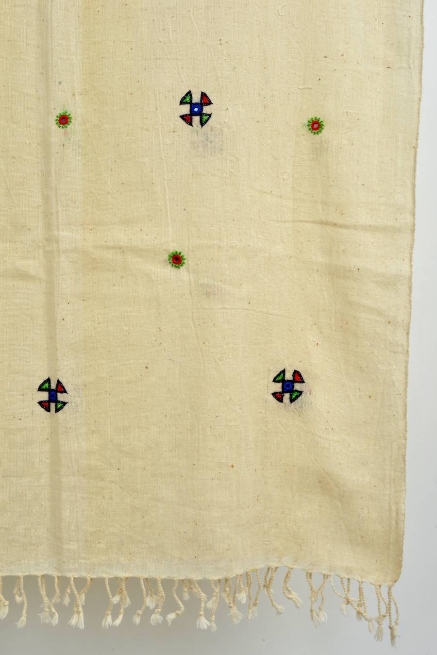 This stole is a unique creation woven from Kala cotton, a sustainable and eco-friendly fabric indigenous to Gujarat. Ahir embroidery, known for its vibrant threads and intricate patterns, adds a stunning contrast to the natural cream base, showcasing the artisan’s dedication to traditional craftsmanship.
