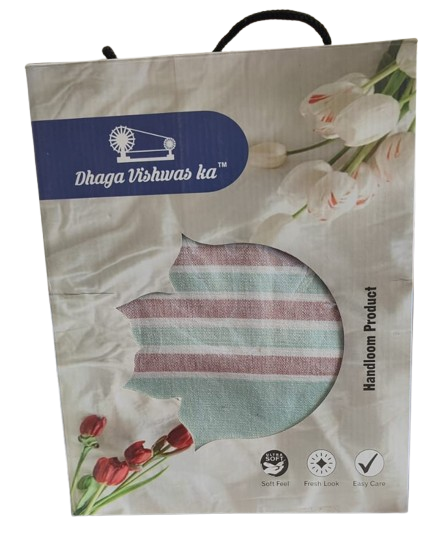 This elegant handloom light blue stole, accented with subtle pink tones, is a versatile addition to your wardrobe. Crafted with precision and care, it reflects the timeless beauty of handmade artistry.