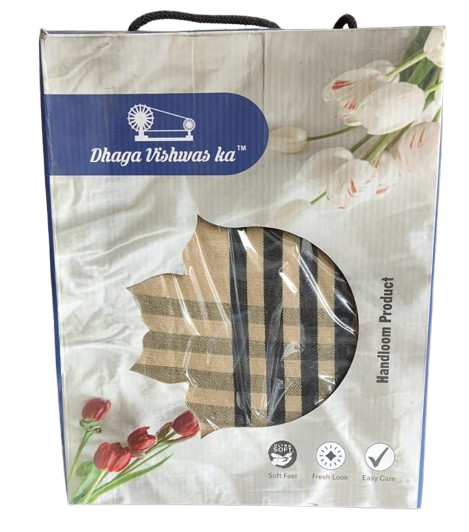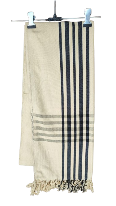 The stole showcases the perfect harmony of off-white cotton fabric adorned with bold black stripes. It is meticulously crafted by skilled artisans using traditional handloom methods, ensuring authenticity and uniqueness. Lightweight yet durable, it complements various outfits, from casual wear to semi-formal ensembles, making it suitable for any season or occasion.