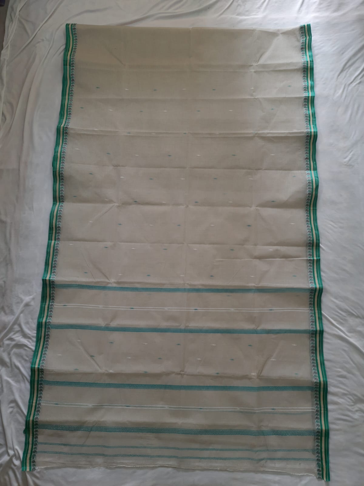 Btengal saree is made by fine cotton count embellished by extra warp designs with multi coloured yarns. It is a simple formation of Bengal cotton saree & woven with figured motifs, in transparent plain ground, with designs of extra warp in borders and extra weft in the body. Use of cotton yarn make it suitable to wear comfortably.