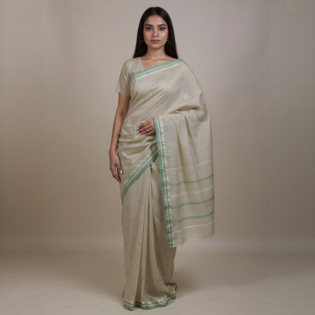 Btengal saree is made by fine cotton count embellished by extra warp designs with multi coloured yarns. It is a simple formation of Bengal cotton saree & woven with figured motifs, in transparent plain ground, with designs of extra warp in borders and extra weft in the body. Use of cotton yarn make it suitable to wear comfortably.