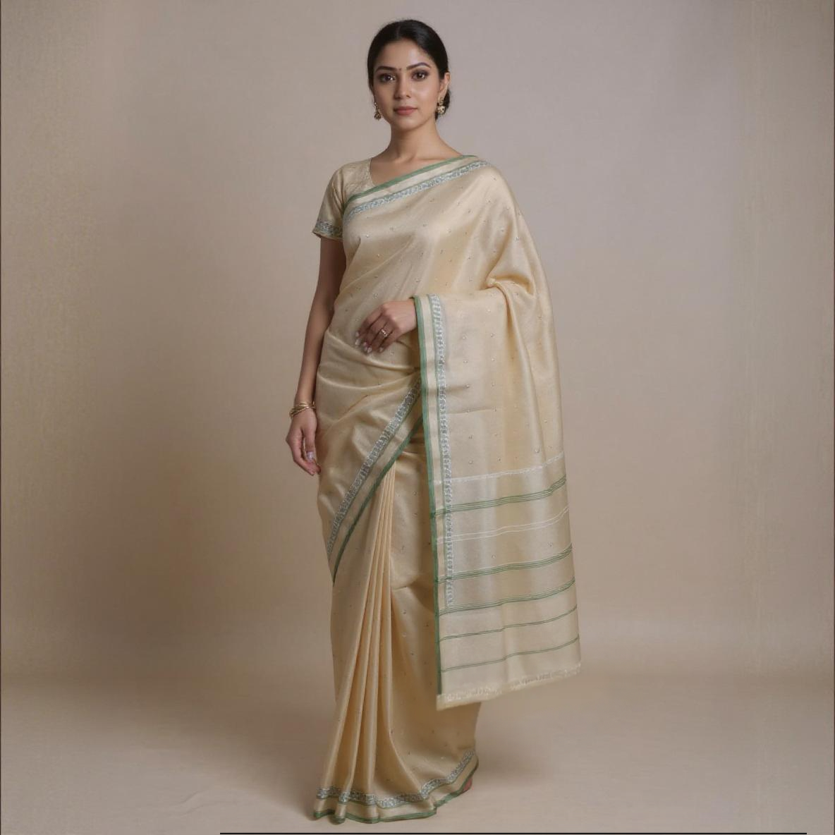 Btengal saree is made by fine cotton count embellished by extra warp designs with multi coloured yarns. It is a simple formation of Bengal cotton saree & woven with figured motifs, in transparent plain ground, with designs of extra warp in borders and extra weft in the body. Use of cotton yarn make it suitable to wear comfortably.
