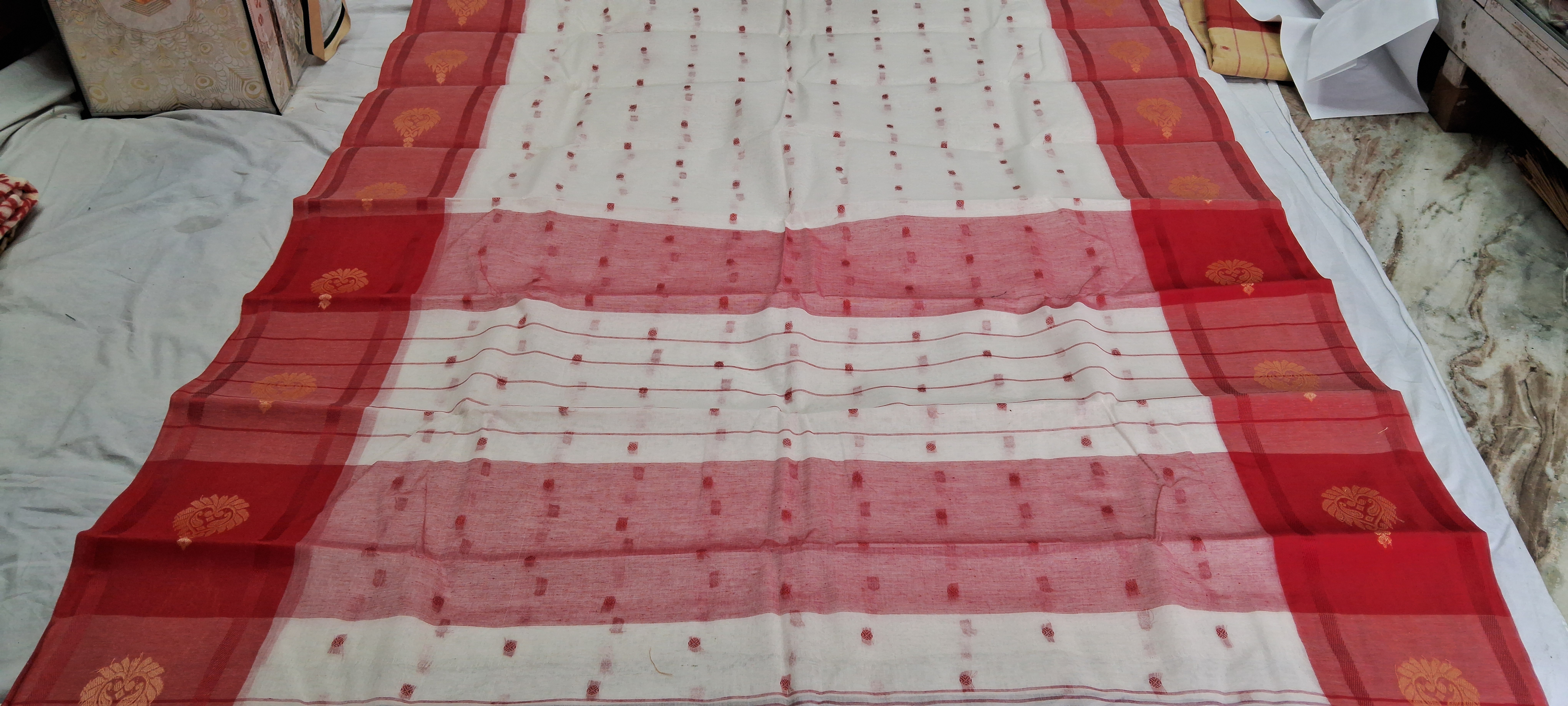 Bengal Soft Cotton Saree | White & Red | 5.5 x 1.19 metres