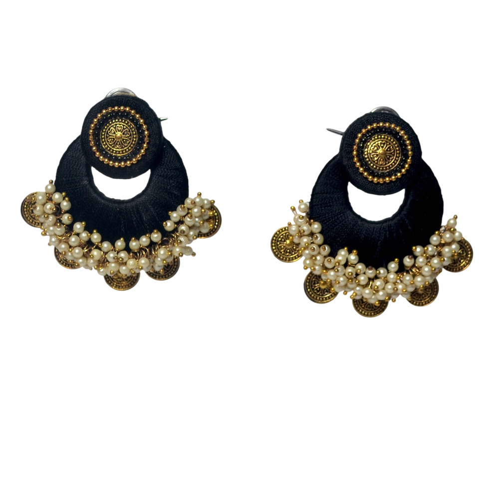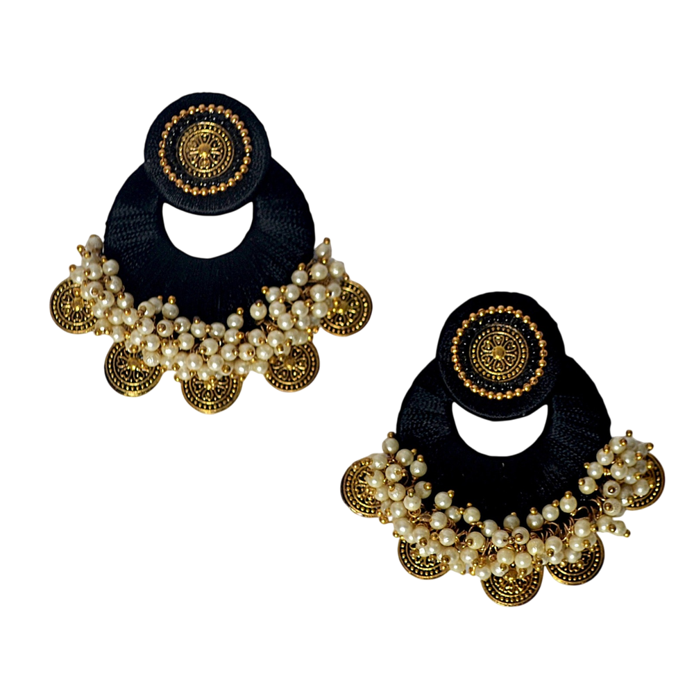 Ginni Thread Elegant Black Fabric Earrings with Golden Detailing Decorative Pearls and Lightweight Design