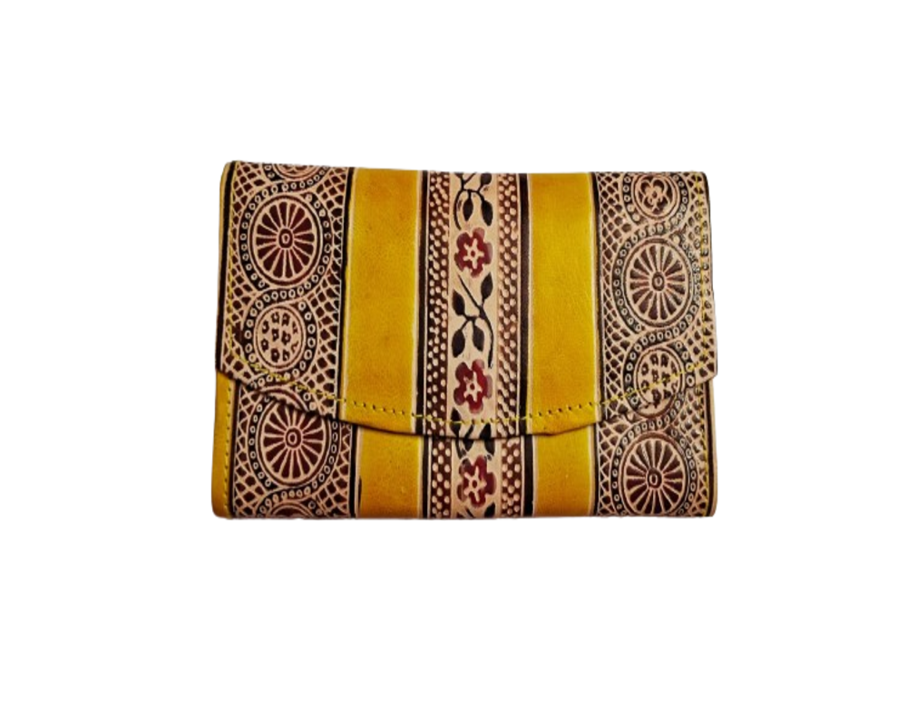 Brighten up your accessory collection with this vibrant leather purse, handcrafted with the finest Shantiniketan techniques from West Bengal. With its intricate embossed designs , this purse is the perfect balance of traditional craftsmanship and modern flair. Ideal for everyday use or special events, it adds a pop of colour and elegance to your ensemble.