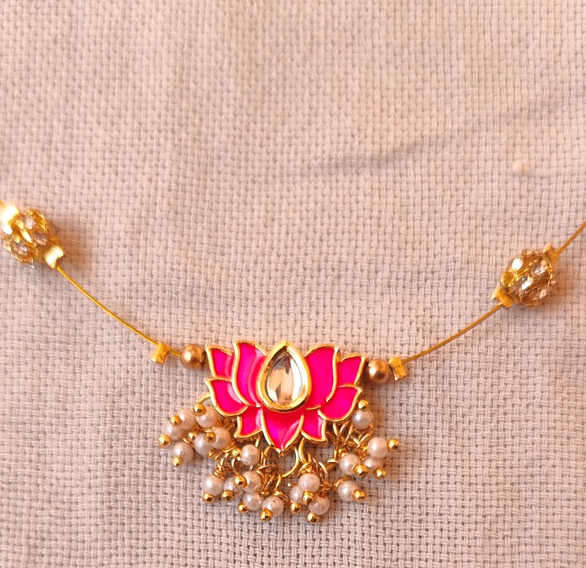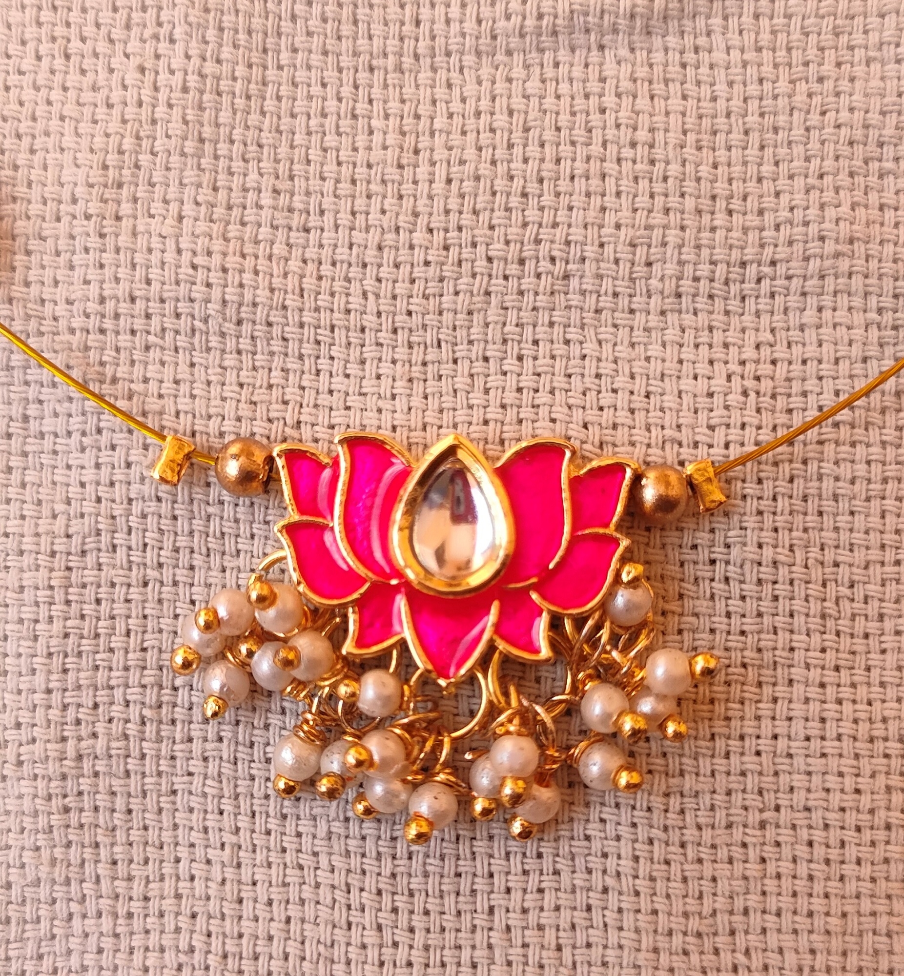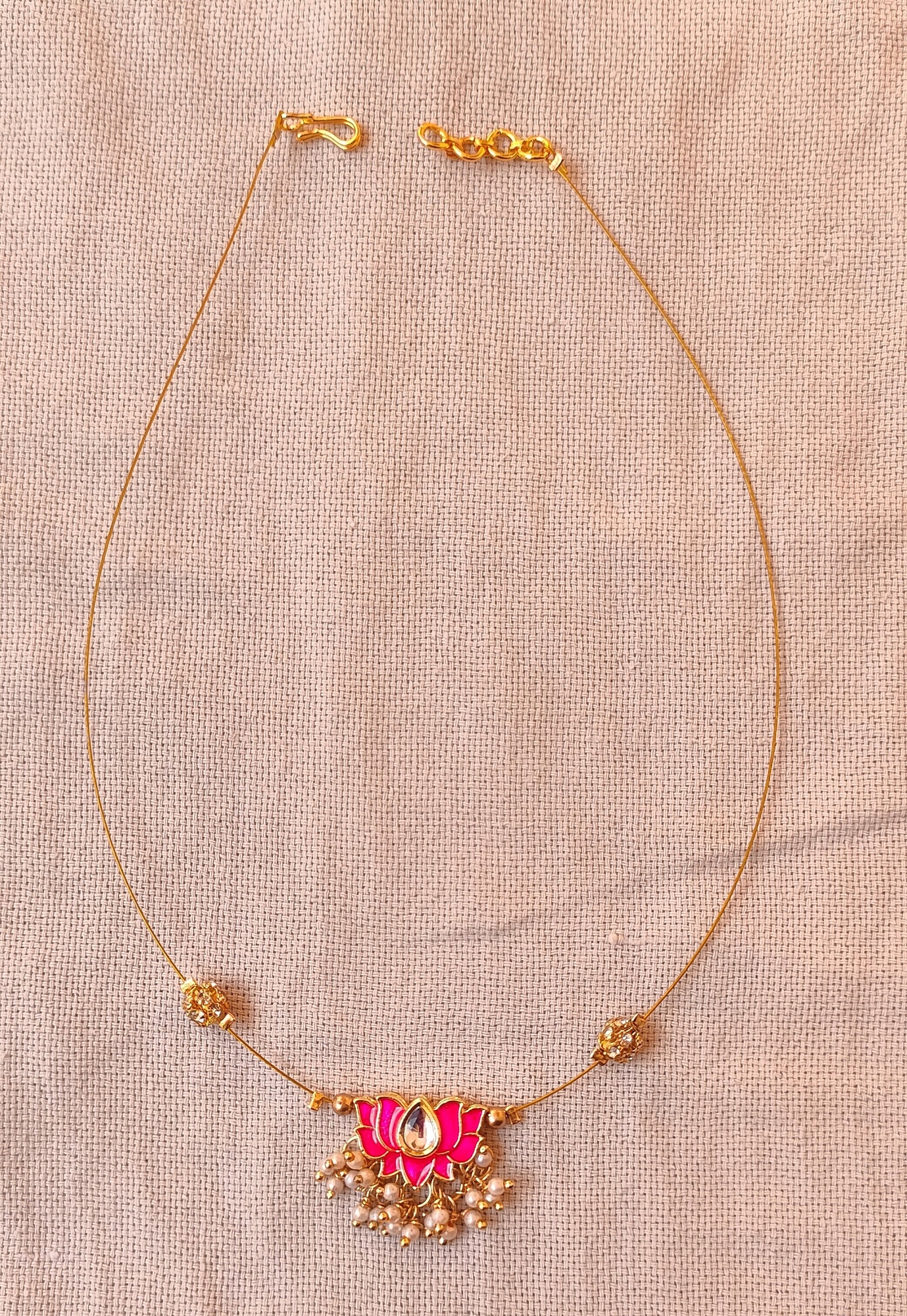 This handcrafted necklace features a delicate gold-tone wire, showcasing an exquisite lotus pendant with vibrant Pink enamel work. A shimmering teardrop stone sits at the heart, surrounded by intricate pearl dangles for an ethereal touch. Lightweight and elegant, it offers all-day comfort with a secure clasp. Perfect for adding a subtle yet striking statement to both traditional and modern looks.