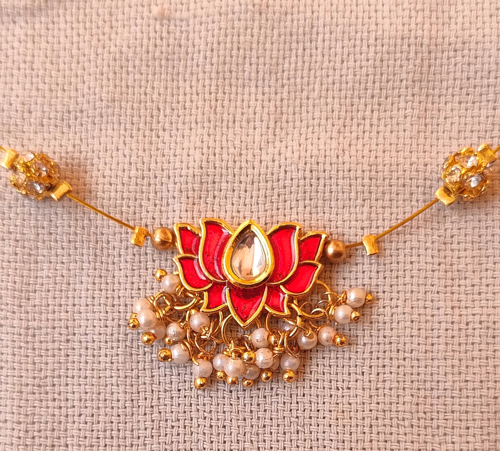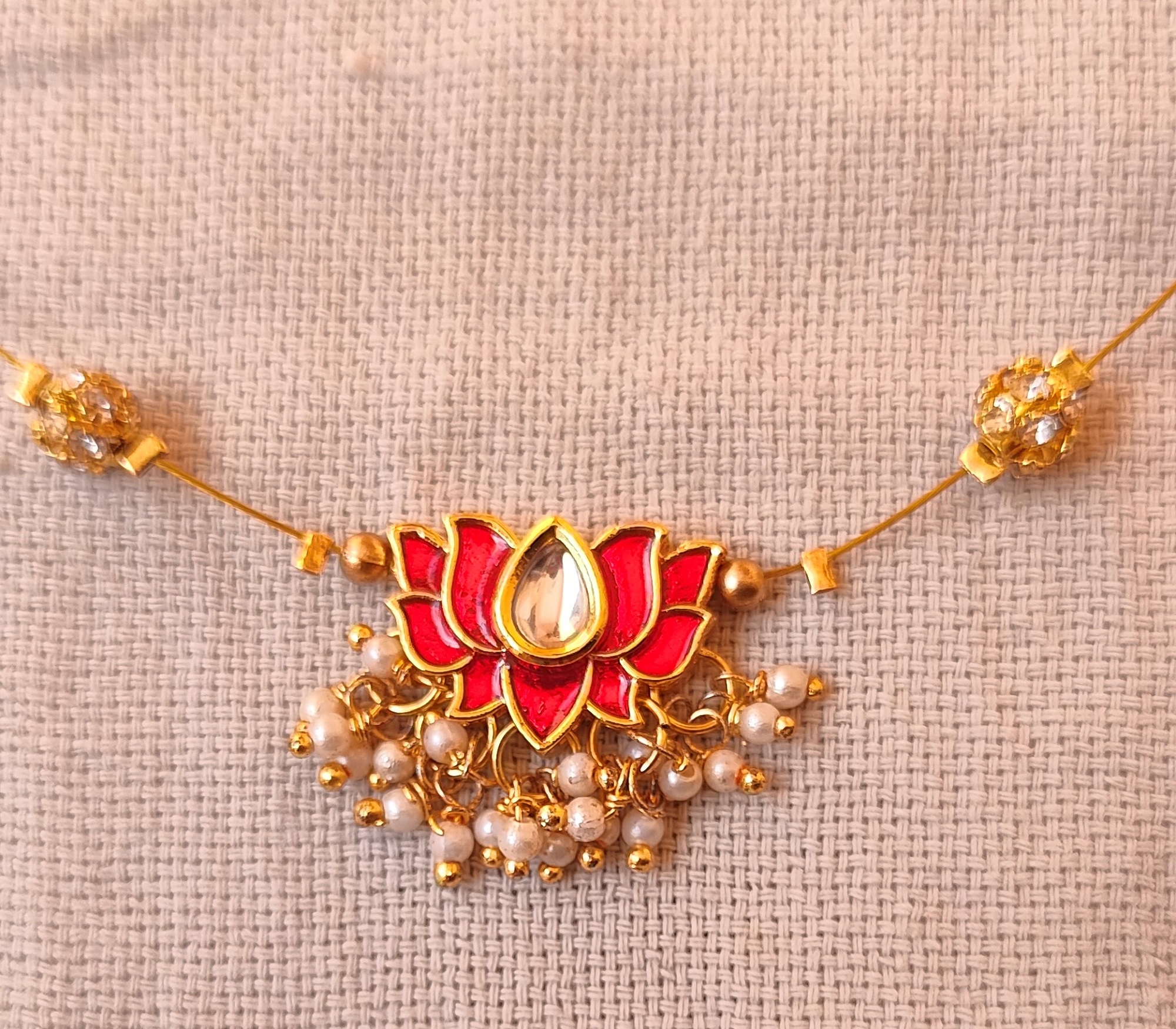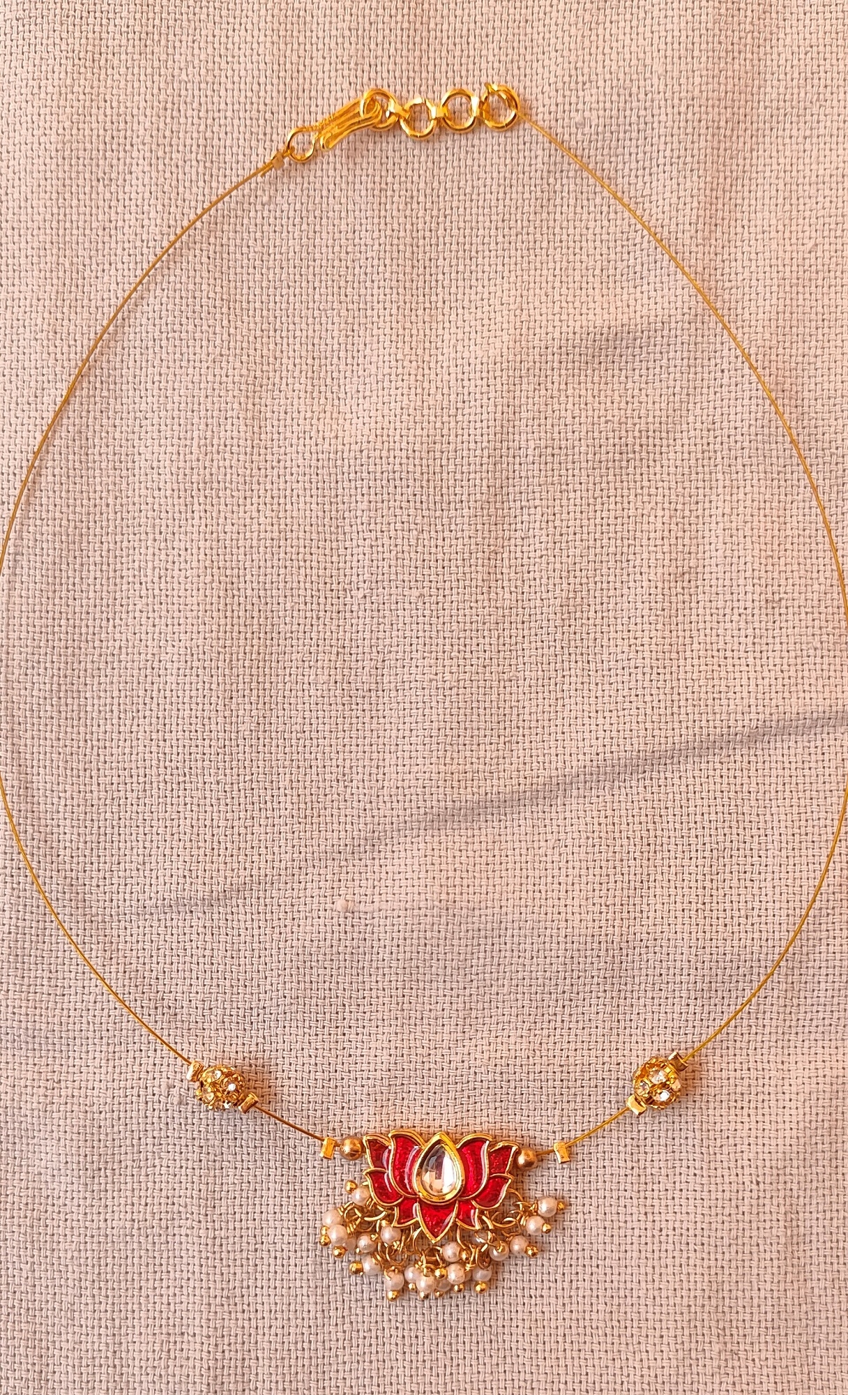 This handcrafted necklace features a delicate gold-tone wire, showcasing an exquisite lotus pendant with vibrant Orange enamel work. A shimmering teardrop stone sits at the heart, surrounded by intricate pearl dangles for an ethereal touch. Lightweight and elegant, it offers all-day comfort with a secure clasp. Perfect for adding a subtle yet striking statement to both traditional and modern looks.