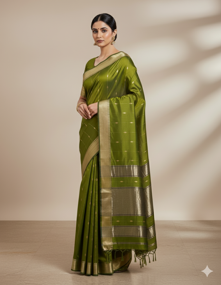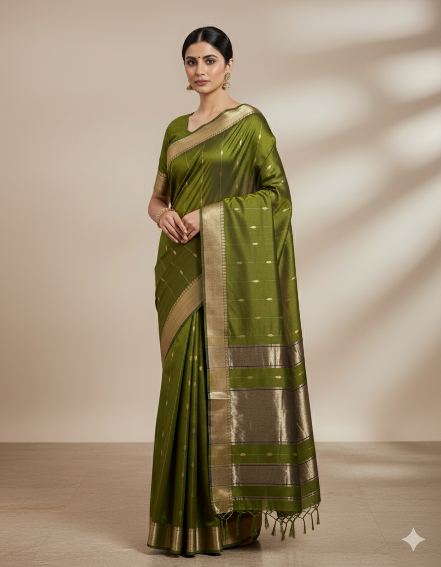 Maheshwari Saree Diamond Border Buti saree | Olive Green