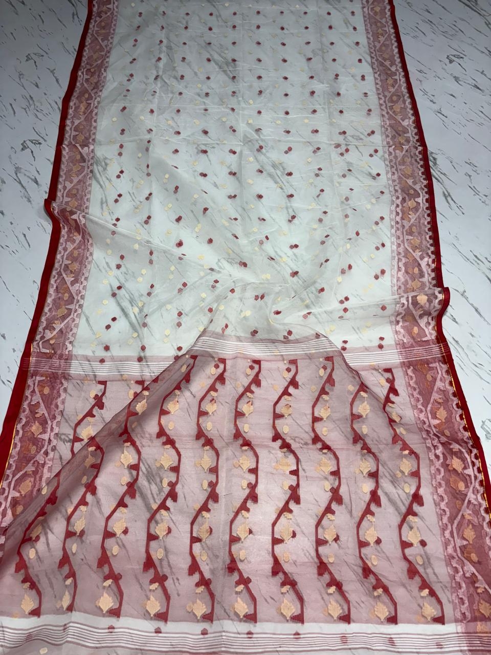 Resham saree is made by fine resham count embellished by extra warp designs with multi coloured yarns. It is a simple formation of resham saree & woven with figured motifs, in transparent plain ground, with designs of extra warp in borders and extra weft in the body. Use of resham yarn make it suitable to wear comfortably.
