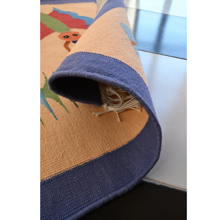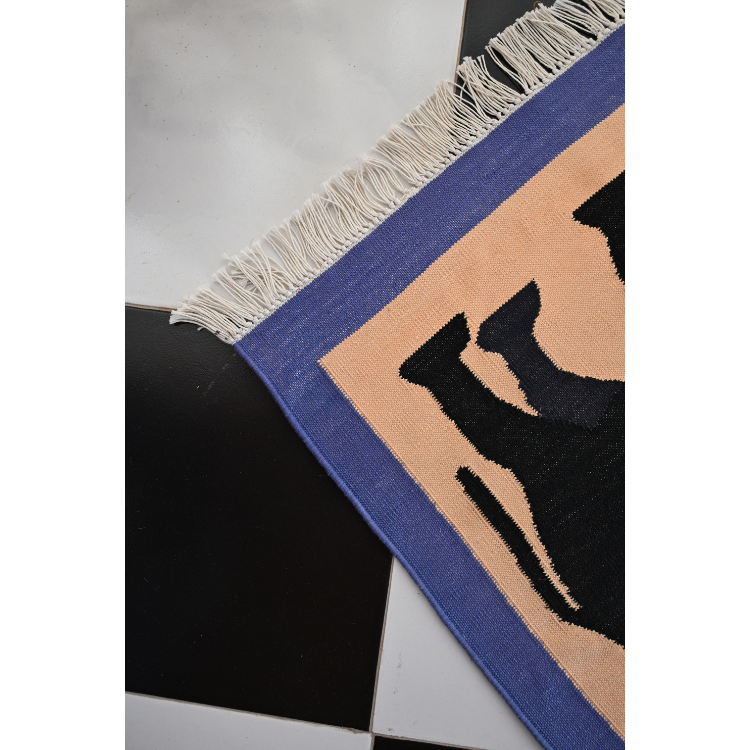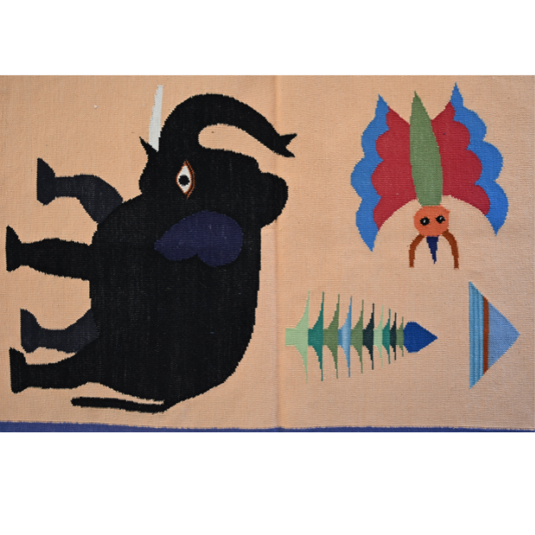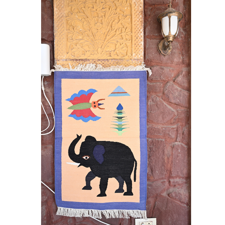 This 2x3 ft handwoven cotton rug features a bold black elephant and vibrant butterfly on a peach backdrop, symbolizing strength and transformation. Crafted on a traditional Salawas Panja loom by skilled Rajasthani artisans, it embodies cultural heritage and eco-conscious artistry. Lightweight yet durable, it’s perfect as a floor accent, wall hanging, or framed decor. Inspired by Indian wildlife and woven with time-honored techniques, this unique dhurrie adds elegance and storytelling to any space—ideal for bohemian, eclectic interiors or as a thoughtful, handmade gift.