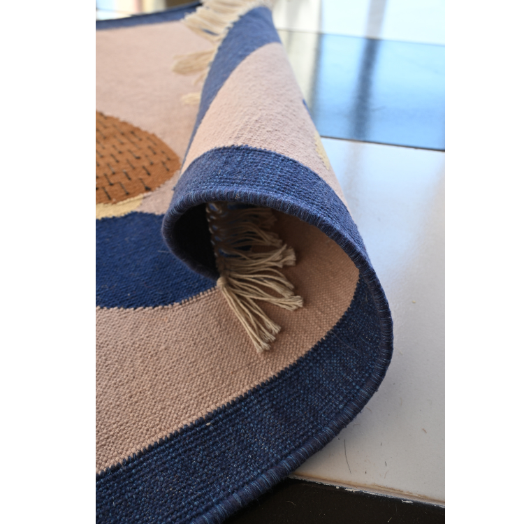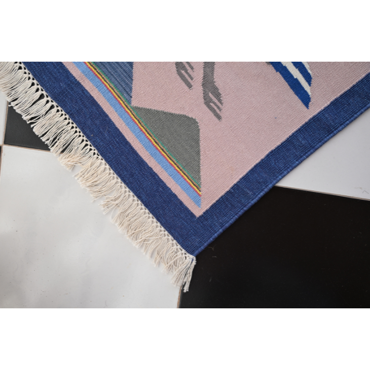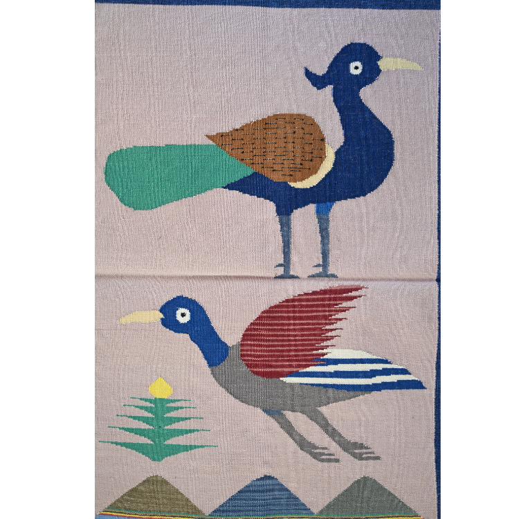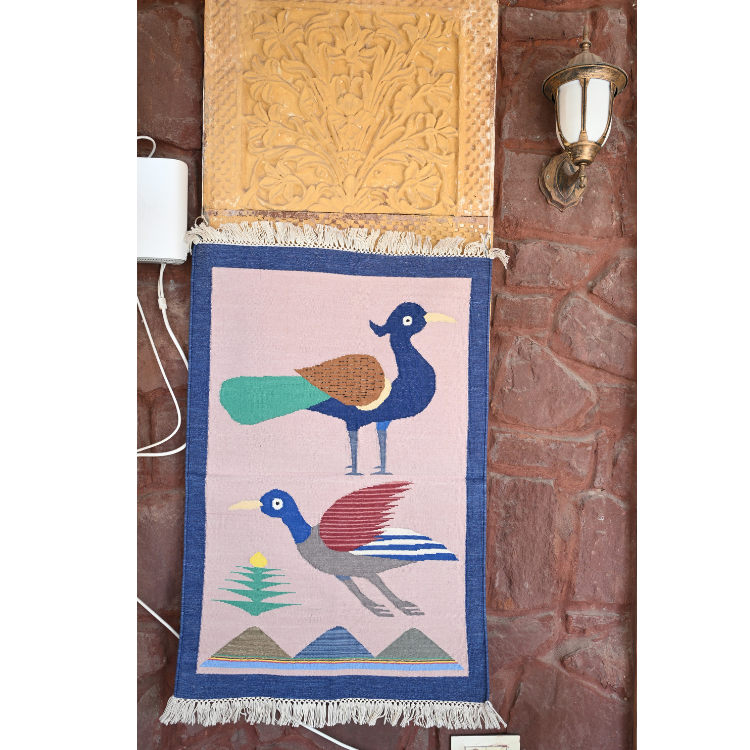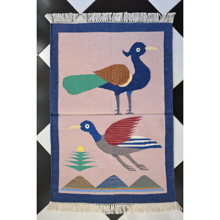 This 2x3 ft handwoven cotton dhurrie features a graceful peacock and swan motif in soft peach and blue tones, symbolizing serenity and beauty. Crafted on a traditional Salawas Panja loom by skilled artisans, it reflects Rajasthan’s rich weaving heritage. Lightweight, durable, and eco-friendly, it’s perfect as a floor rug, wall hanging, or framed art. Inspired by Indian wildlife and nature, each rug is a unique, sustainable masterpiece that adds elegance to any space—ideal for thoughtful gifting or elevating bohemian, eclectic, or traditional interiors.