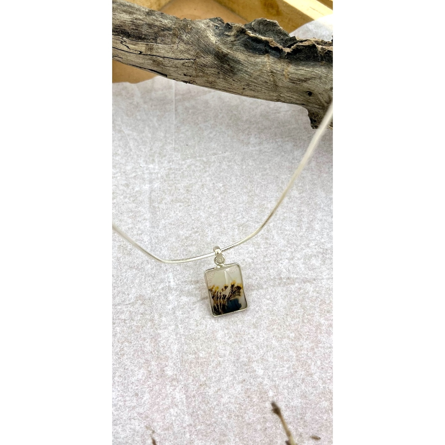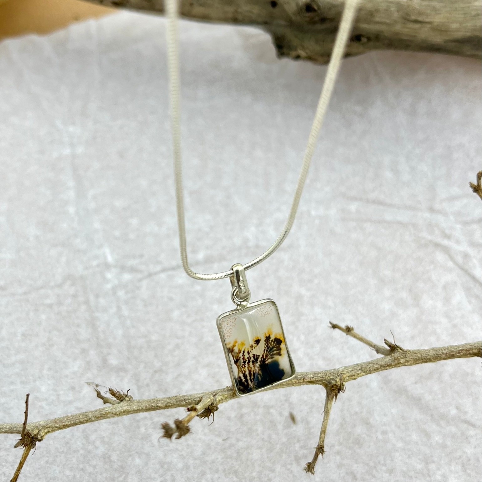 Rectangular Shazar silver pendant titled Forest Dream laid on a soft textured backdrop with rustic wood accents and a delicate silver chain. Styled presentation of Forest Dream pendant hanging gracefully from a branch, emphasizing its earthy and artisanal appeal. Close-up of the Forest Dream pendant showcasing intricate dendritic agate patterns resembling a field of trees in golden tones.