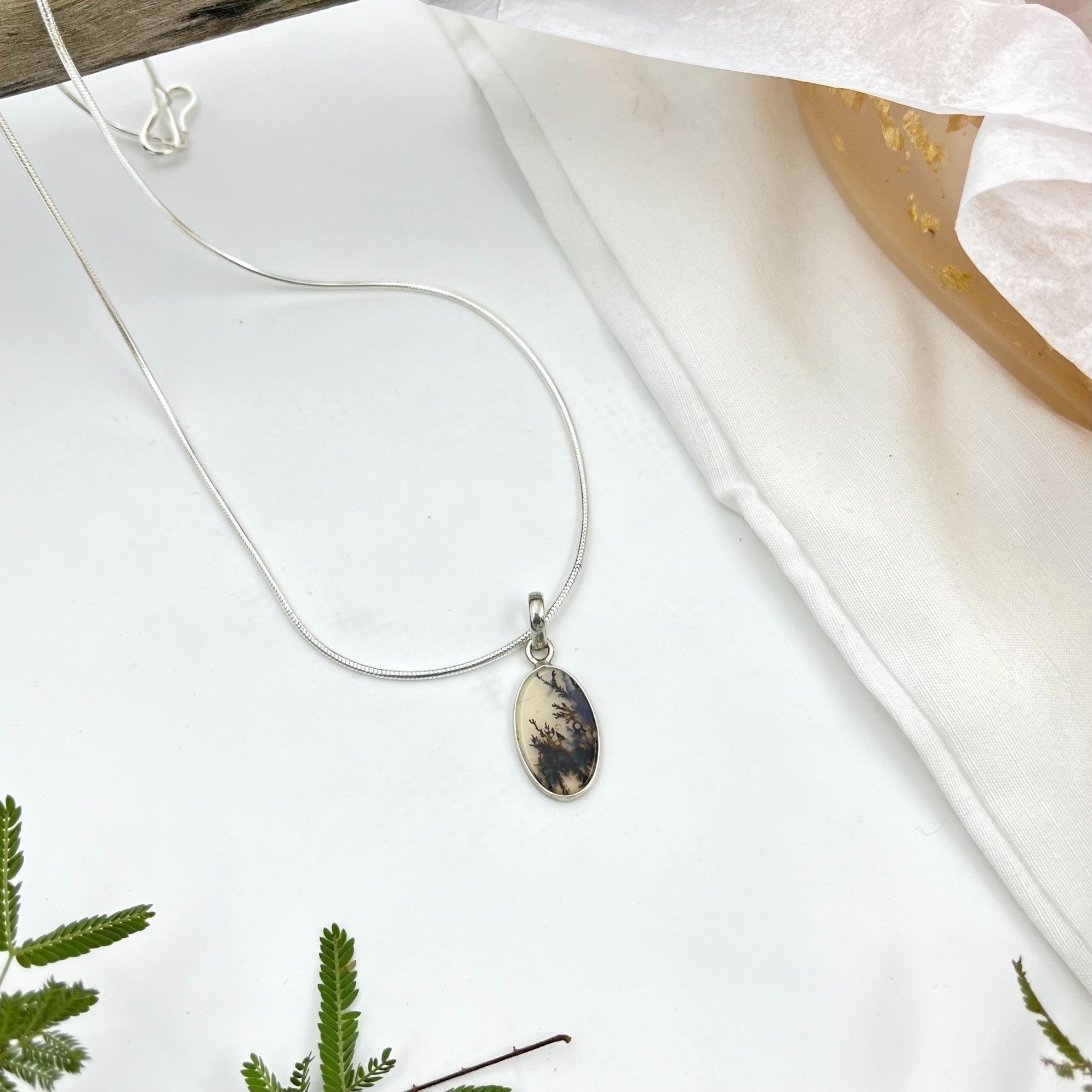 Close view of the agate’s blooming black and golden dendrites on a cream-toned base, evoking a forest blossoming in moonlight. Nightbloom Shazar silver pendant by Ochrello featuring an oval dendritic agate stone with intricate dark natural inclusions set in sterling silver. Pendant styled on soft beige textures and natural wood, reflecting organic elegance and the mystery of a bloom beneath the stars.