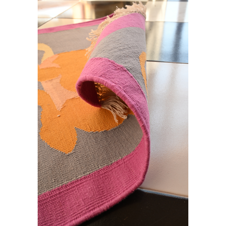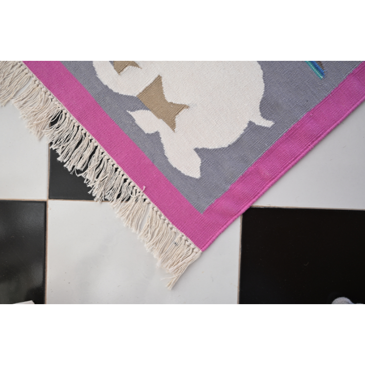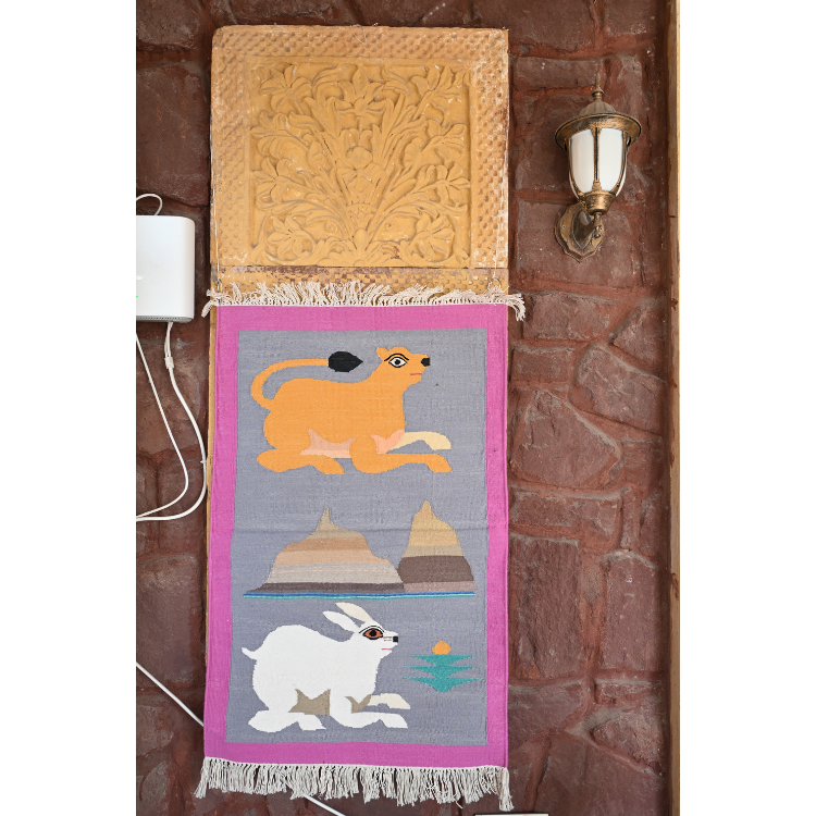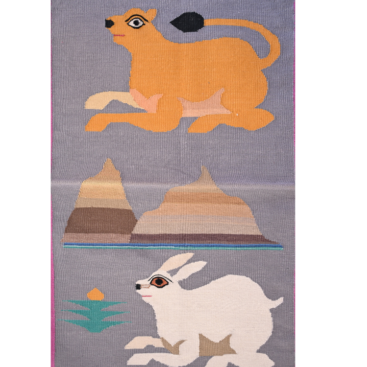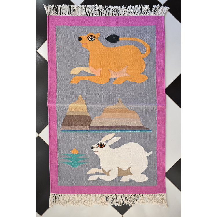 This bold handwoven 2×3 ft cotton dhurrie depicts a lion and rabbit motif symbolizing harmony, rendered in soothing pastel hues of pink, grey, white, and yellow. Woven on a traditional Salawas Panja loom by skilled Rajasthani artisans, it combines lightweight durability with artisanal elegance, making it perfect as a floor rug, wall hanging, framed textile art, or table cover. Made from 100% eco‑friendly, chemical‑free cotton, each unique piece showcases intricate wildlife and floral patterns inspired by Indian heritage. Easy to care for—vacuum, spot‑clean, or gentle hand wash; avoid prolonged sunlight. Ideal for bohemian, Indian, or eclectic interiors and thoughtful gifting, this Lion & Rabbit Rug enriches any space with warmth, tradition, and timeless beauty.