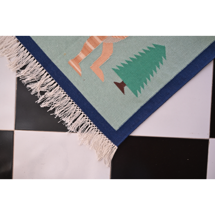This handwoven 2×3 ft 100% cotton dhurrie features a charming rabbit and deer motif set against calming light green and brown hues. Woven on a traditional Salawas Panja loom by skilled Rajasthani artisans, it combines lightweight durability with eco‑friendly craftsmanship. Versatile as a floor rug, wall hanging, framed textile art, or meditation mat, it celebrates India’s rich heritage. Care is effortless: vacuum, spot‑clean, or gently hand‑wash and avoid prolonged sunlight. Perfect for rustic, woodland‑inspired, boho‑chic, or modern interiors—and as a thoughtful gift—this rug infuses any space with warmth, elegance, and timeless tradition.