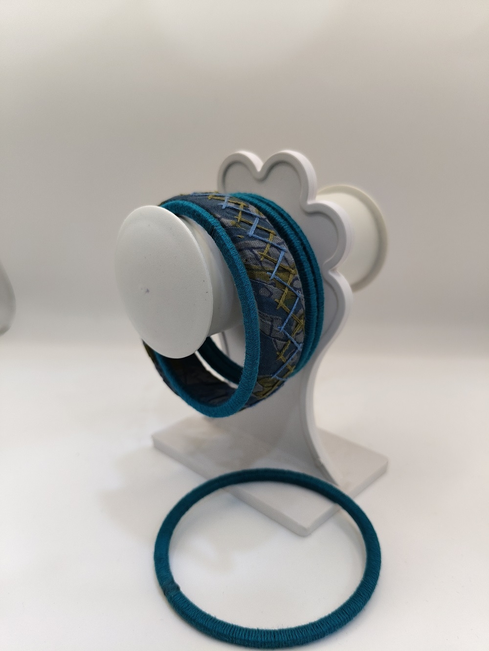 These beautiful handcrafted bangles are wrapped in soft teal blue thread and accented with intricately embroidered fabric in Kantha-inspired patterns. Lightweight, eco-friendly, and created by skilled Indian artisans, these bangles blend traditional textile art with modern style. Ideal for casual wear, festivals, or thoughtful gifting.