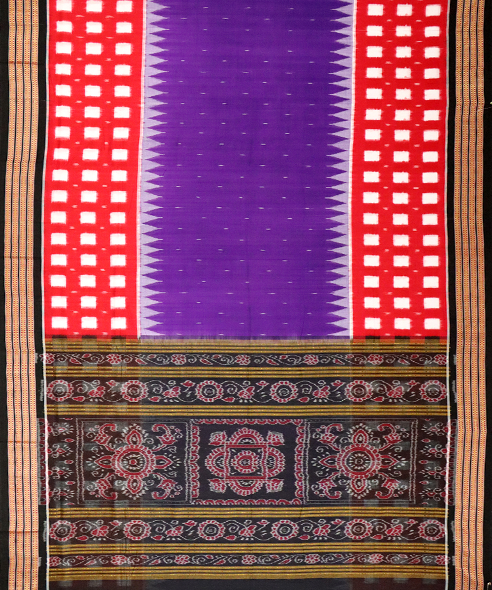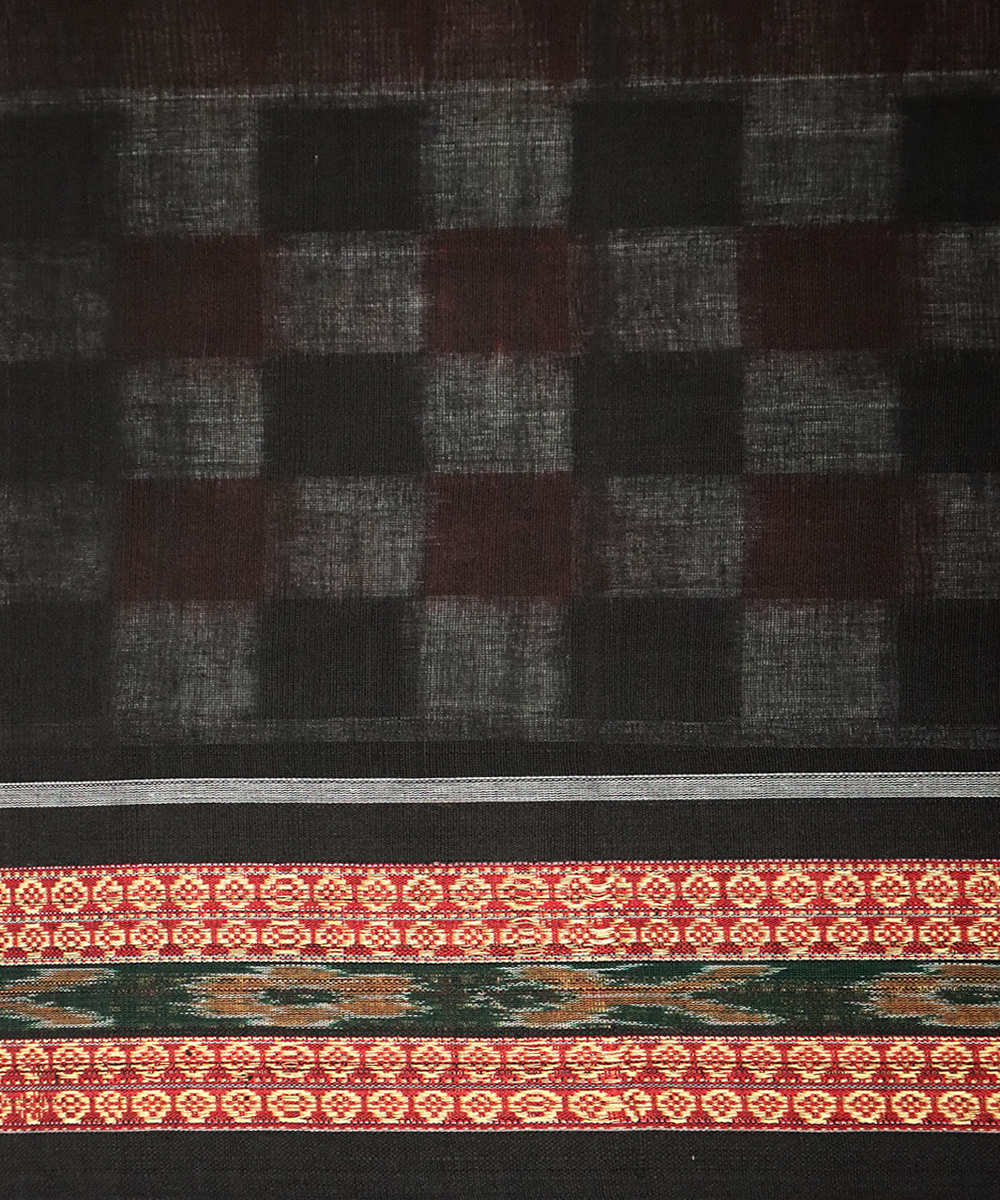 Exclusive Handwoven sambalpuri cotton saree multicolour base with traditional ikat in body , border black base with rudraksha dobby & Pallu black base with traditional Ikat, Blouse piece attached with black