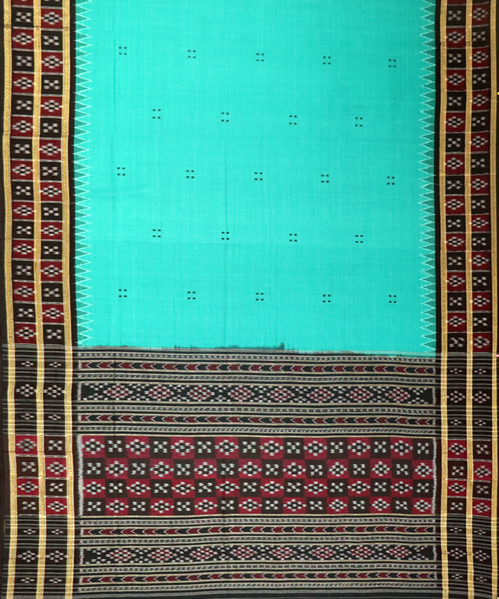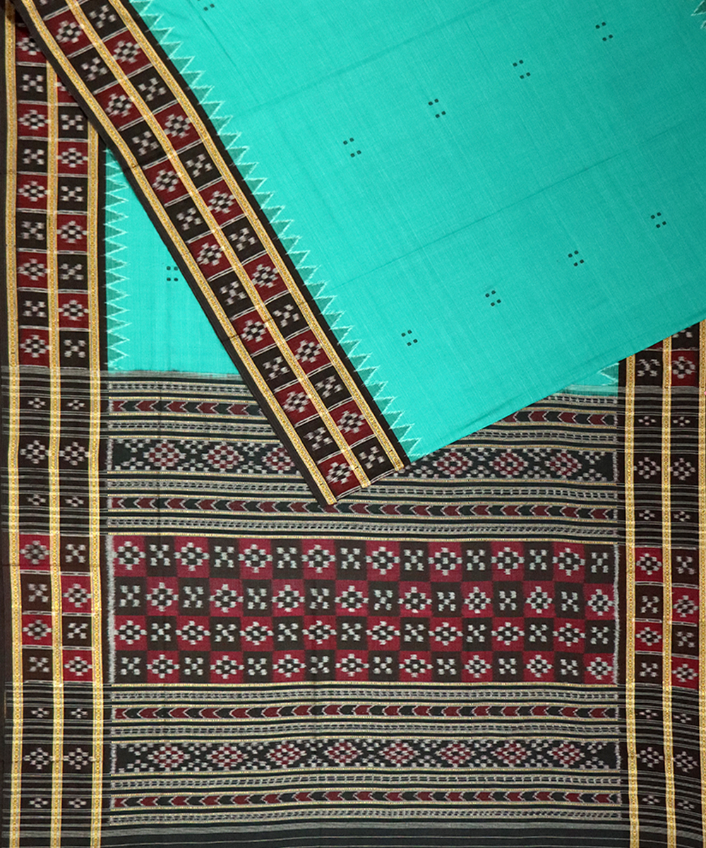 Exclusive Handwoven nuapatna cotton saree dark green base with Traditional ikat in body & border black base with pasapali ikat & dobby & Pallu black base with traditional ikat ,Saree has Blouse piece.