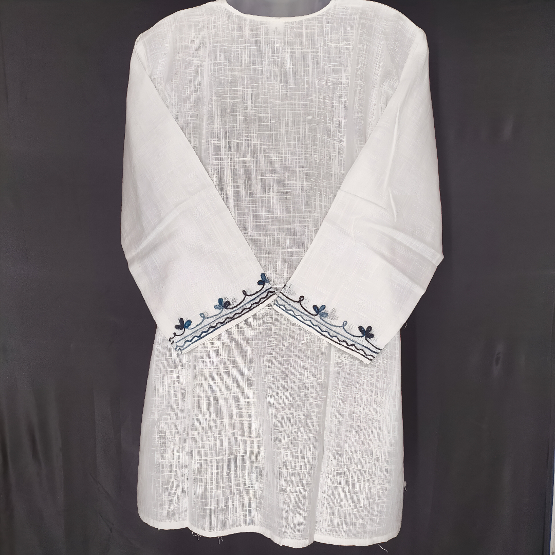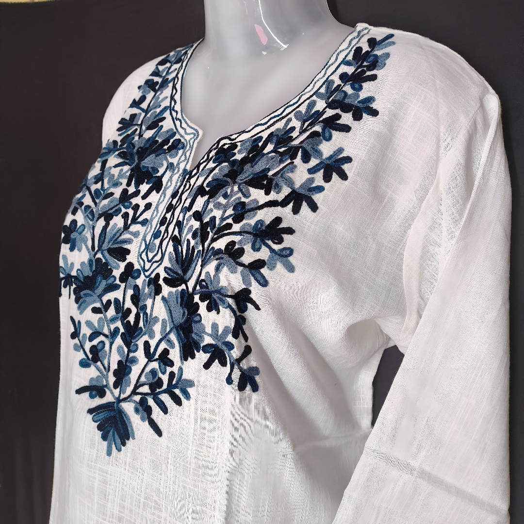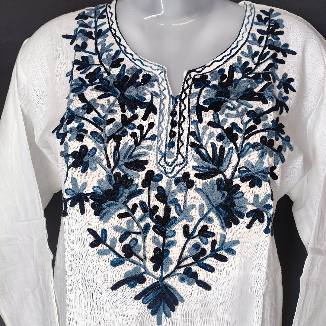 Elegant white cotton kurti featuring intricate blue Kashmiri-style floral embroidery on the neckline, front, cuffs, and hem. Designed with a round neck and V-slit, full sleeves, and a comfortable fit, perfect for casual and ethnic occasions. Lightweight and breathable fabric ensures all-day comfort.