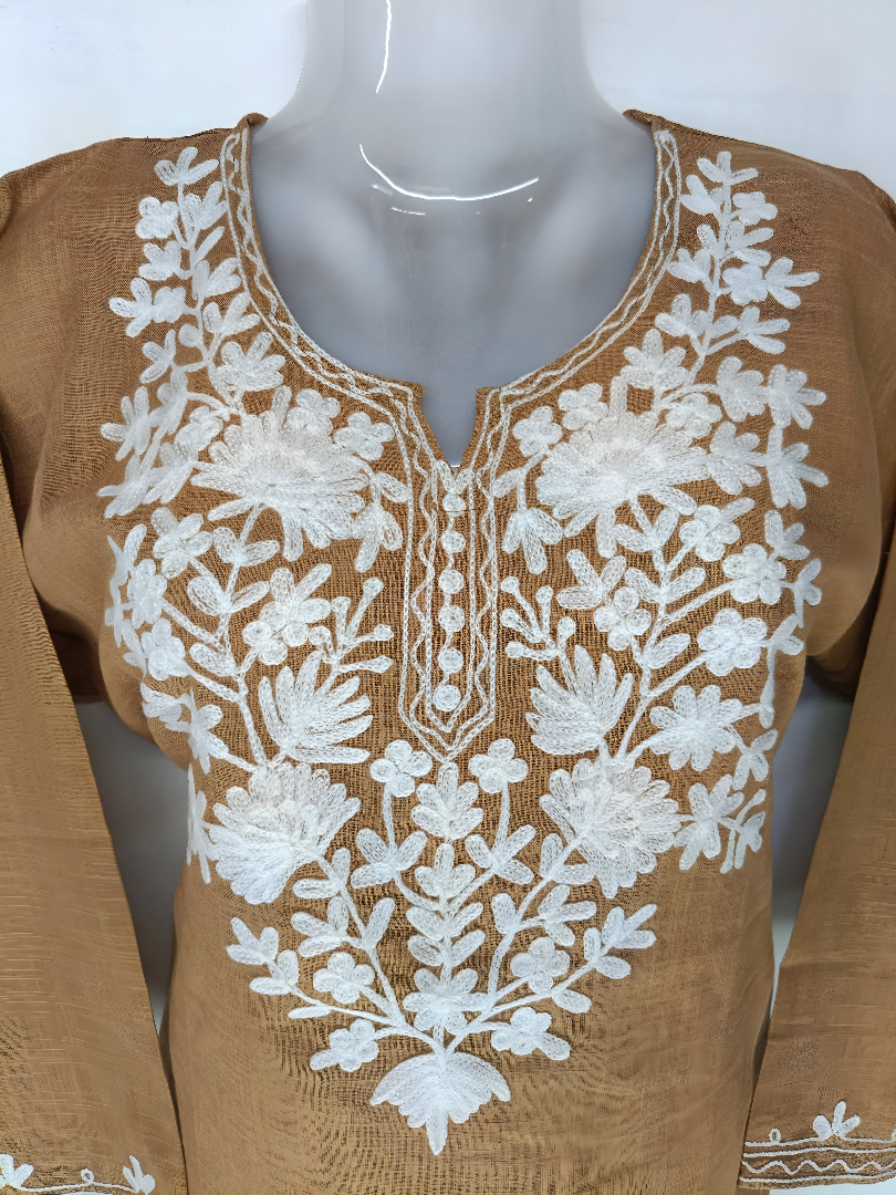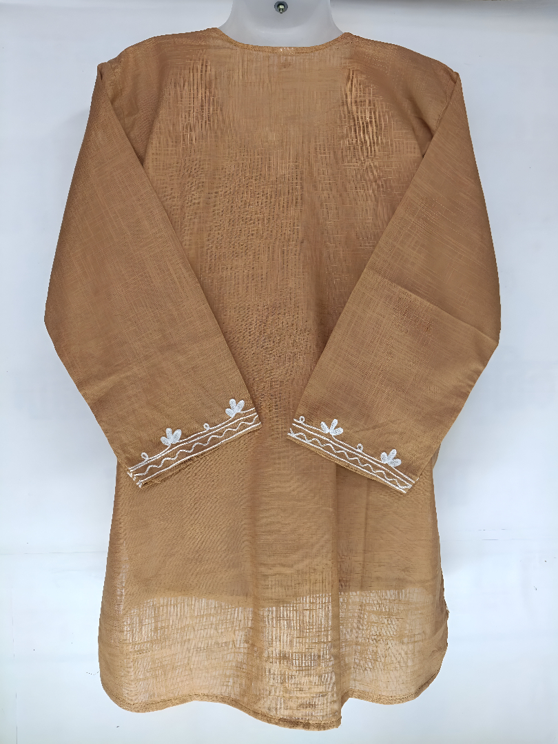 Graceful light brown cotton kurti adorned with intricate white Chikankari-style embroidery, featuring a V-slit neckline and 3/4 sleeves—ideal for everyday elegance and ethnic charm.