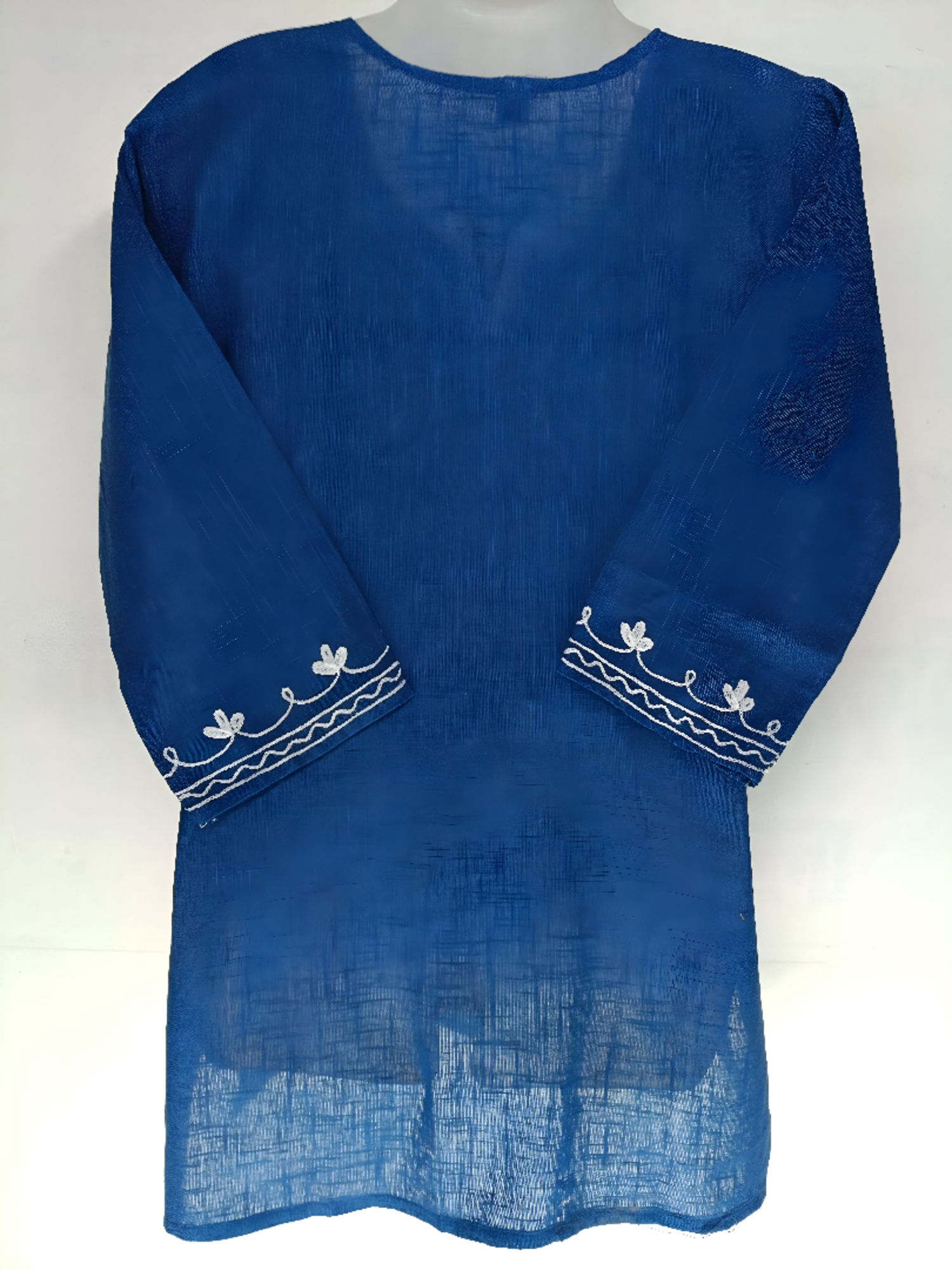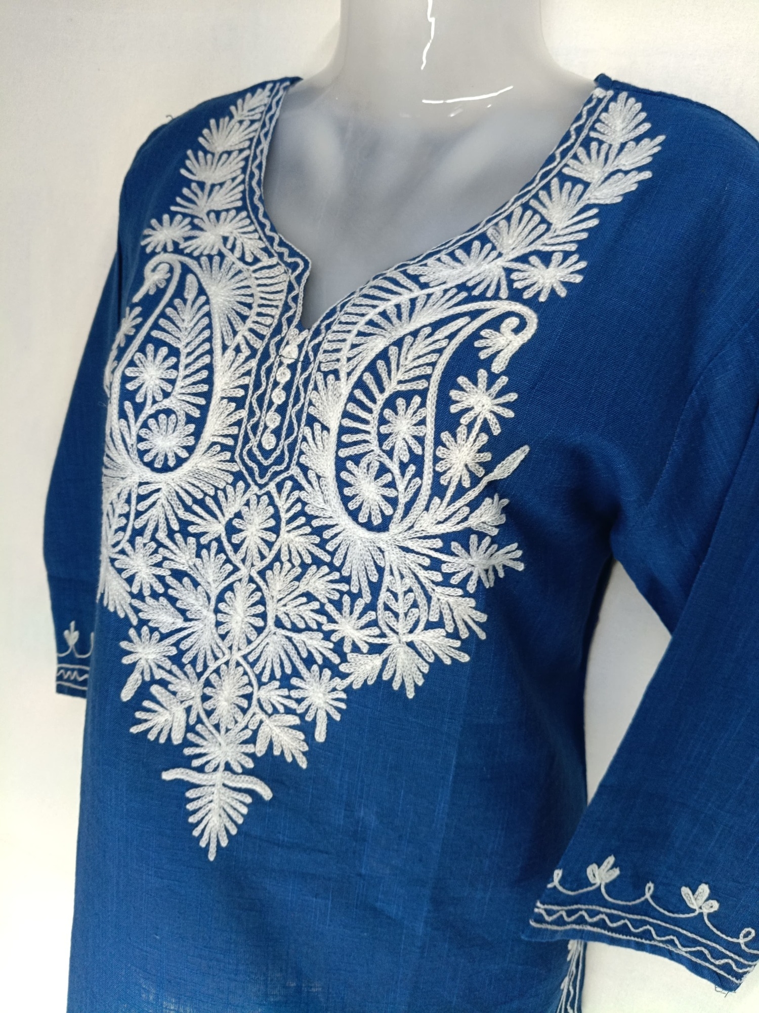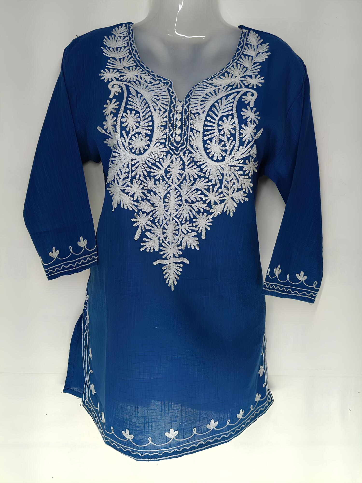 Enhance your ethnic wardrobe with this elegant navy blue cotton kurti featuring intricate white chikankari embroidery. Designed with a classic V-neck and 3/4th sleeves, this kurti offers both comfort and style. The soft, breathable fabric makes it ideal for all-day wear, while the detailed embroidery on the front, sleeves, and hemline adds a traditional charm. Perfect for casual outings, festive occasions, or daily office wear, this kurti blends grace with simplicity effortlessly.