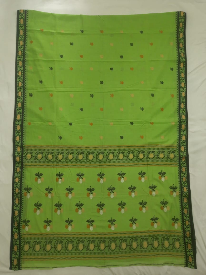 Tangail saree is made by fine cotton count embellished by extra warp designs with multi coloured yarns. It is a simple formation of Jamdani cotton saree & woven with figured motifs, in transparent plain ground, with designs of extra warp in borders and extra weft in the body. Use of cotton yarn make it suitable to wear comfortably.