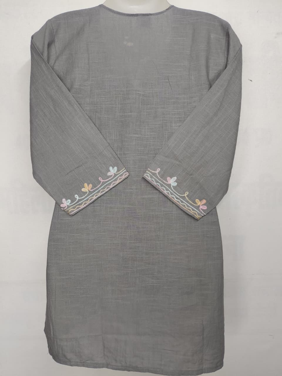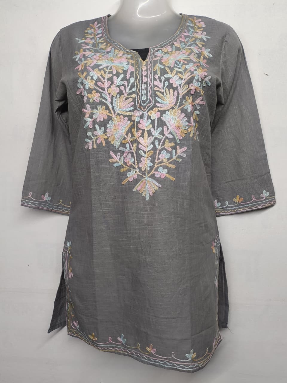 Elegant grey cotton kurti adorned with delicate multicolor floral embroidery. Designed with a round notch neckline, 3/4th sleeves, and side slits, it offers both comfort and style. Perfect for casual outings, office wear, or ethnic gatherings.