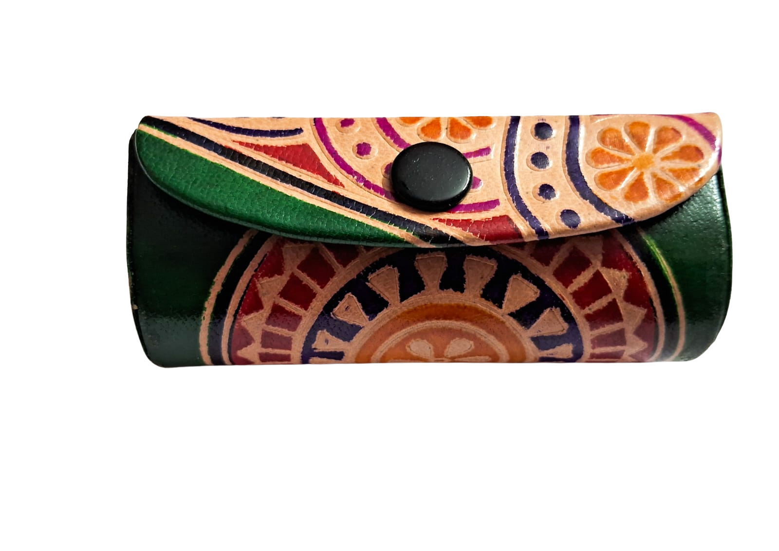 This case is made from handpicked, high-quality leather, known for its durability and soft texture. It’s then brought to life with delicate hand-painted motifs inspired by India’s cultural designs, making each piece beautifully distinct. The compact mirror inside adds a practical touch for on-the-go elegance, making it a fusion of convenience and charm.