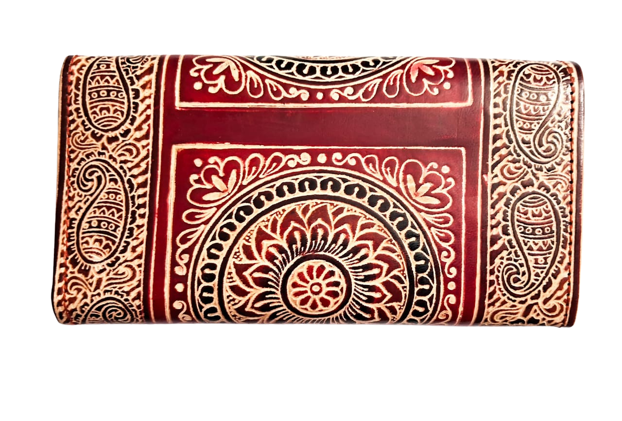 Crafted from genuine leather, this purse showcases the iconic Shantiniketan artistry with traditional embossed motifs on both sides. The leather is carefully burnished for a rich, glossy finish that enhances the intricate details. With a practical zip closure and multiple compartments, this purse combines style with functionality. A testament to the rich cultural legacy of West Bengal, it is a perfect blend of tradition and modernity.
