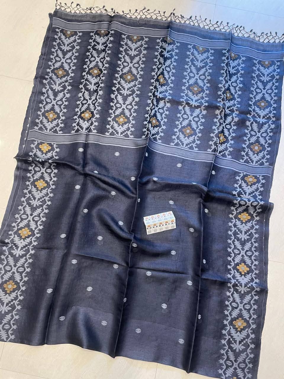 Tussar saree is made by fine count embellished by extra warp designs with multi coloured yarns. It is a simple formation of saree & woven with figured motifs, in transparent plain ground, with designs of extra warp in borders and extra weft in the body.
