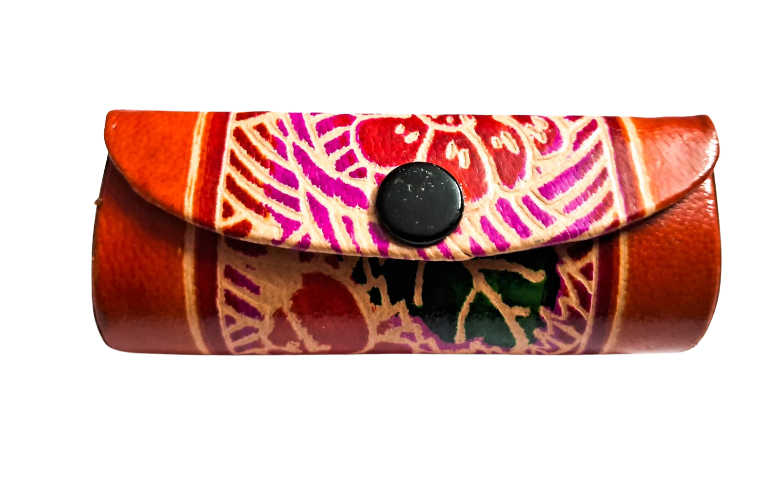 This case is made from handpicked, high-quality leather, known for its durability and soft texture. It’s then brought to life with delicate hand-painted motifs inspired by India’s cultural designs, making each piece beautifully distinct. The compact mirror inside adds a practical touch for on-the-go elegance, making it a fusion of convenience and charm.