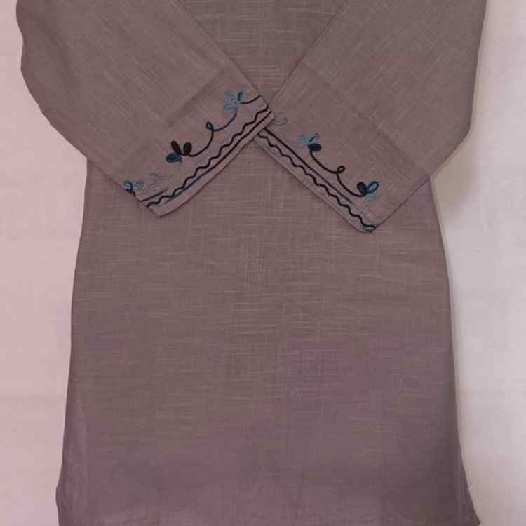 Elegant grey cotton kurti adorned with beautiful blue floral embroidery on the front, sleeves, and hem. Designed with a round neck and slit, 3/4th sleeves, and side slits for comfort, making it perfect for casual and ethnic wear.