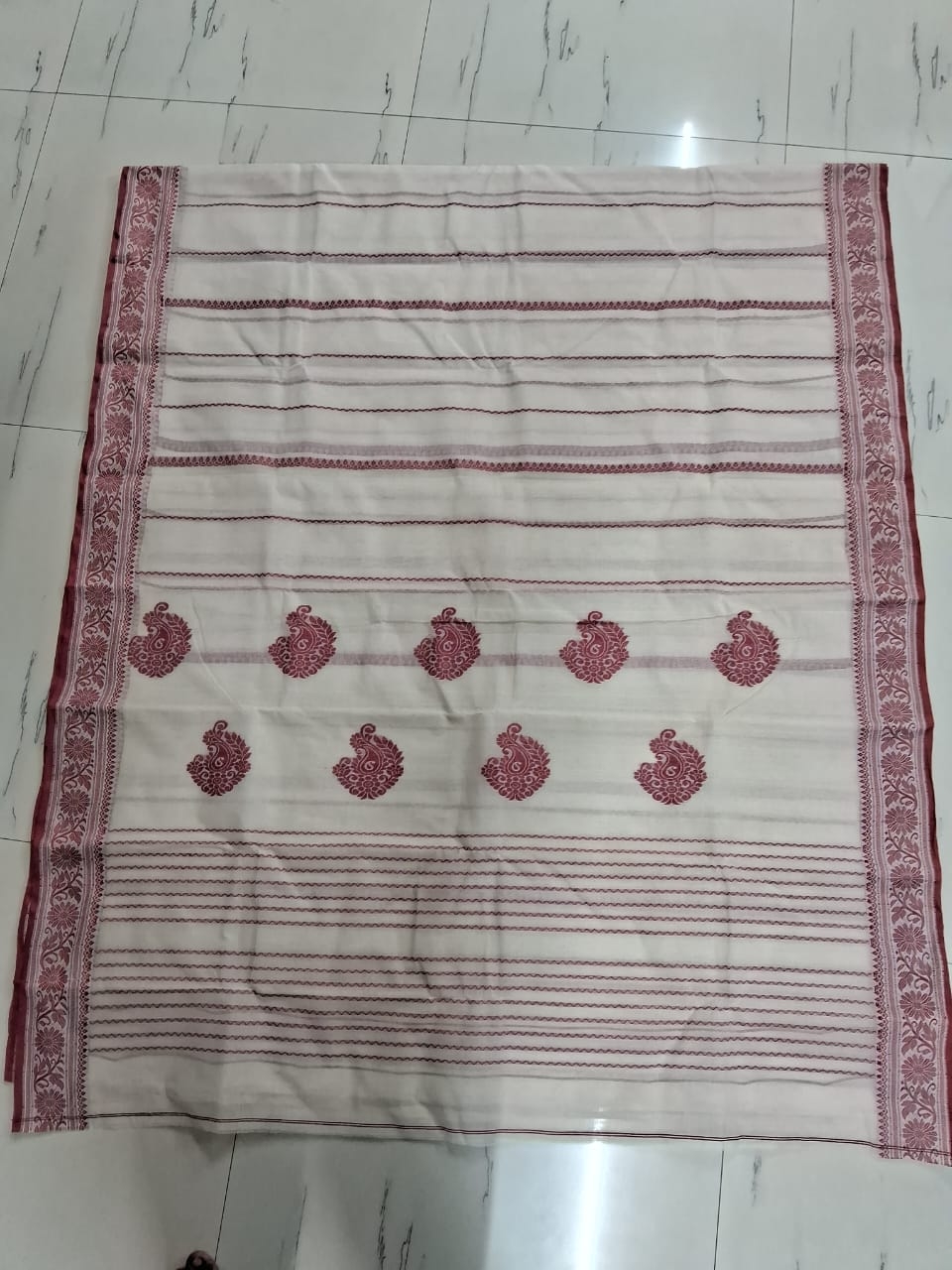 Cotton saree is made by fine cotton count embellished by extra warp designs with multi coloured yarns. It is a simple formation of cotton saree & woven with figured motifs, in transparent plain ground, with designs of extra warp in borders and extra weft in the body. Use of cotton yarn make it suitable to wear comfortably.