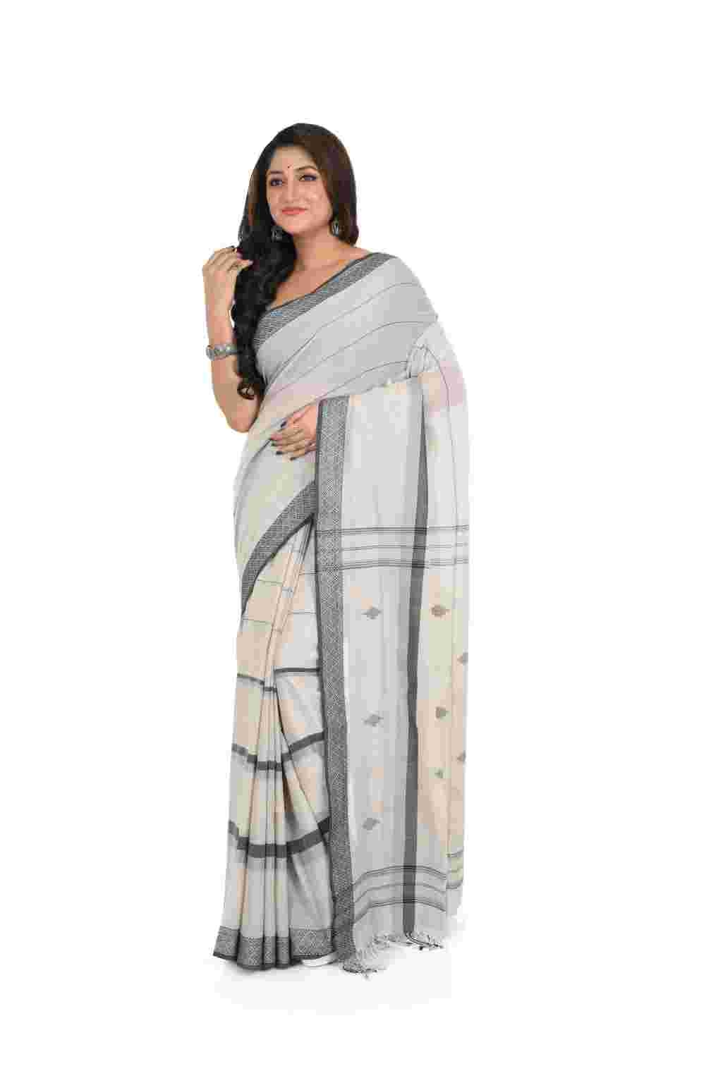 Handloom Bengal Cotton Santipuri Saree | White & Black