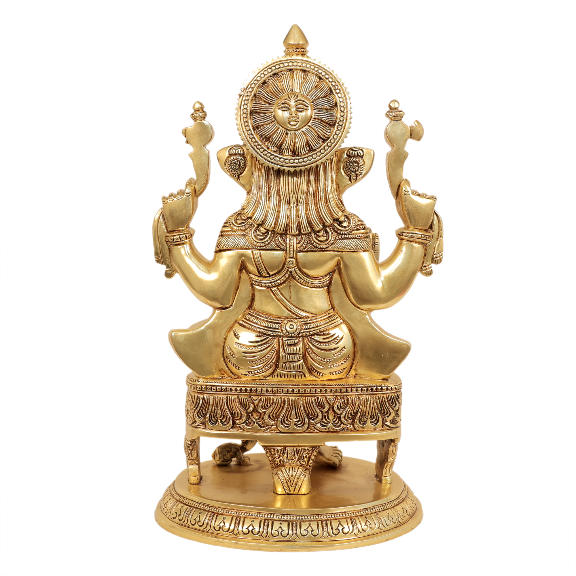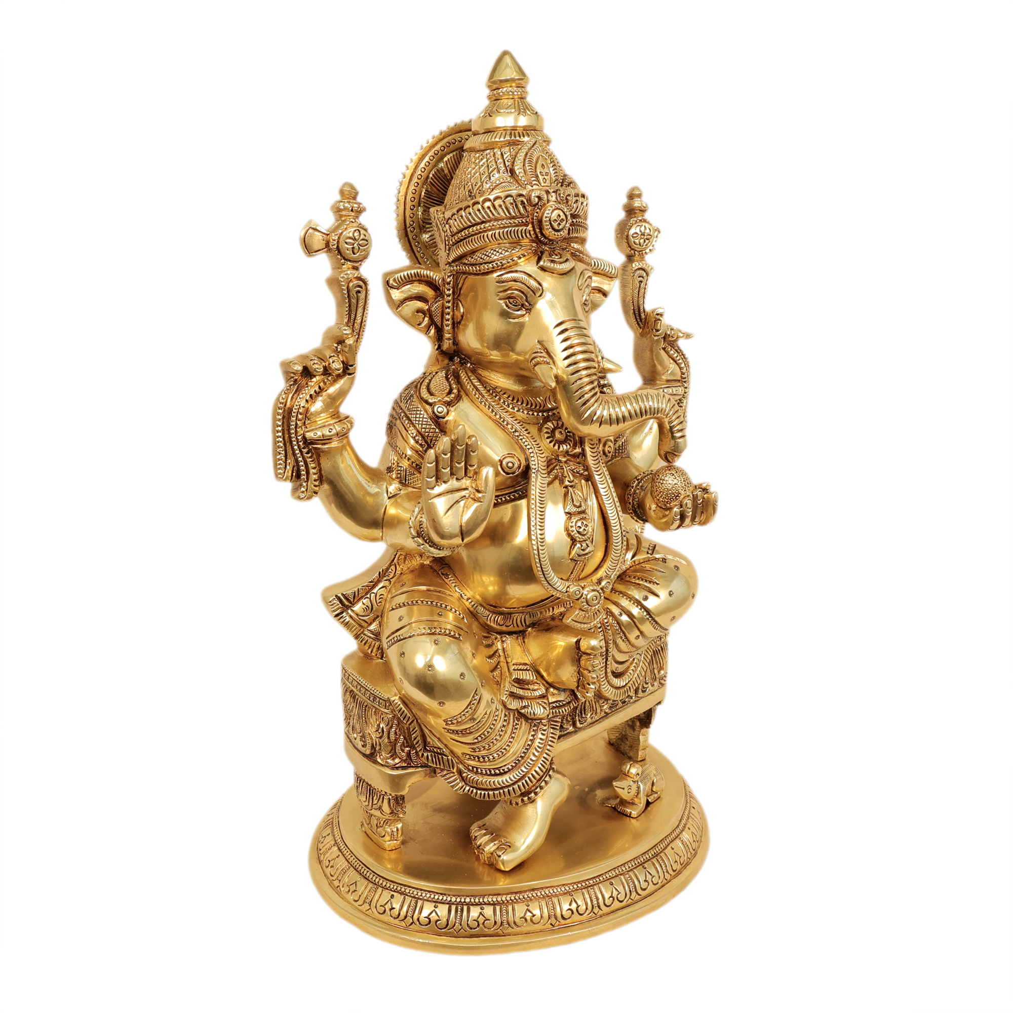 Brass Ganesha Idol - Premium Handcrafted Indian Decor, Bring divine blessings to your home with our Premium Brass Ganesha Idol, a handcrafted masterpiece from Indian artisans. This large Ganesha statue, measuring 9 x 7 x 15.2 inches (22.86 x 17.78 x 38.6 cm) and weighing 9.8 kg, shows Lord Ganesha in a serene pose, removing obstacles and bringing good luck. Made from pure brass, it has a shiny golden look that stays bright without much care. Perfect for pooja rooms, living areas, or as a gift for festivals like Ganesh Chaturthi or housewarmings. The heavy weight keeps it steady on any surface, and the detailed carving adds traditional charm to modern homes. Easy to maintain—just wipe with a soft cloth. Shop this brass Ganesha idol for authentic Indian handicraft that boosts your space with positive energy.