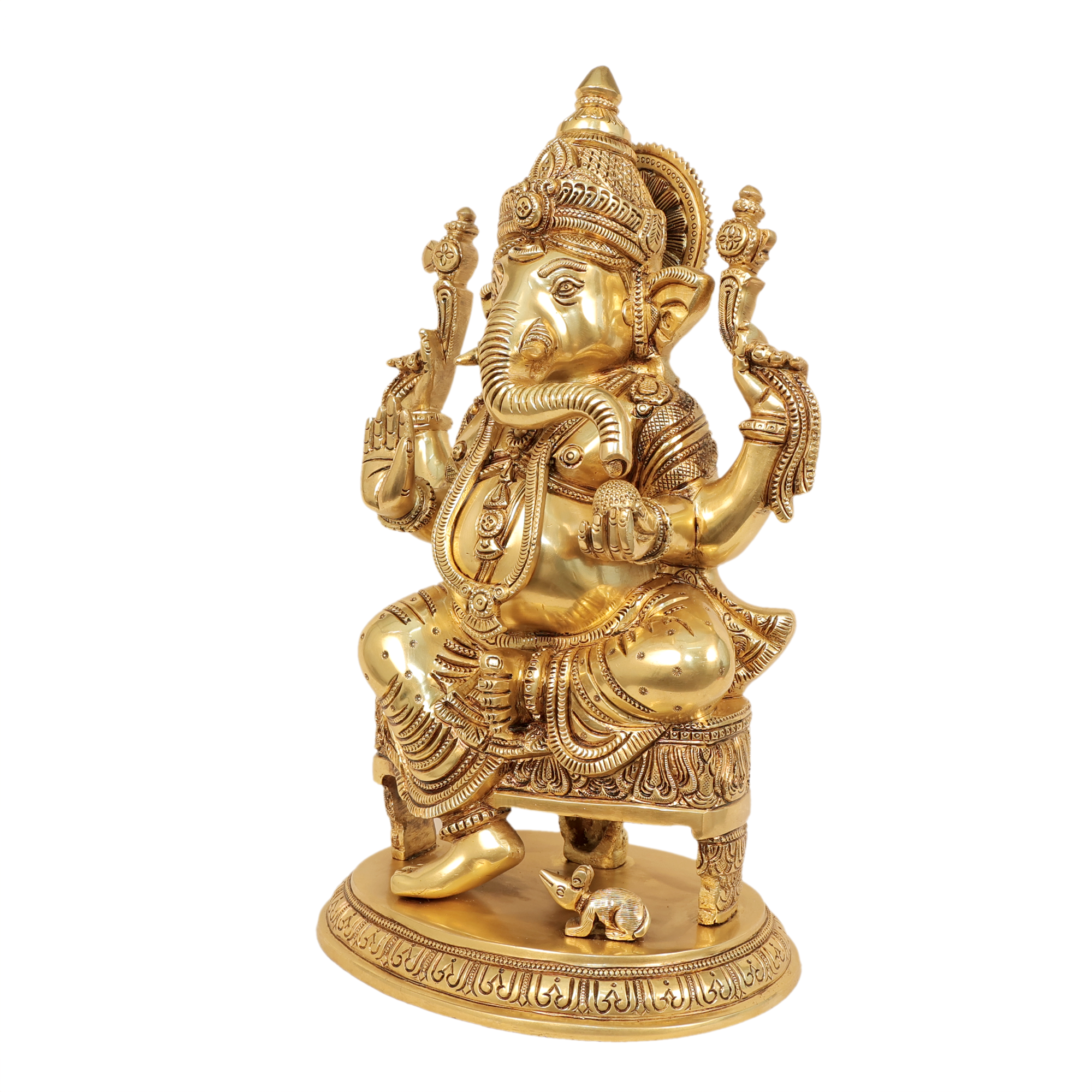 Detailed Handcrafted Design: Beautifully carved brass Ganesha idol, symbol of wisdom and prosperity, ideal for pooja room or home decor.