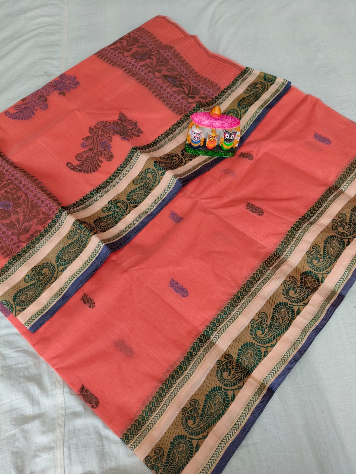 Cotton saree is made by fine cotton count embellished by extra warp designs with multi coloured yarns. It is a simple formation of cotton saree & woven with figured motifs, in transparent plain ground, with designs of extra warp in borders and extra weft in the body. Use of cotton yarn make it suitable to wear comfortably.