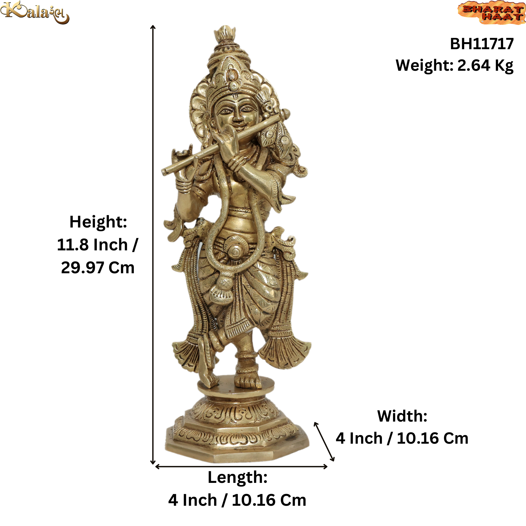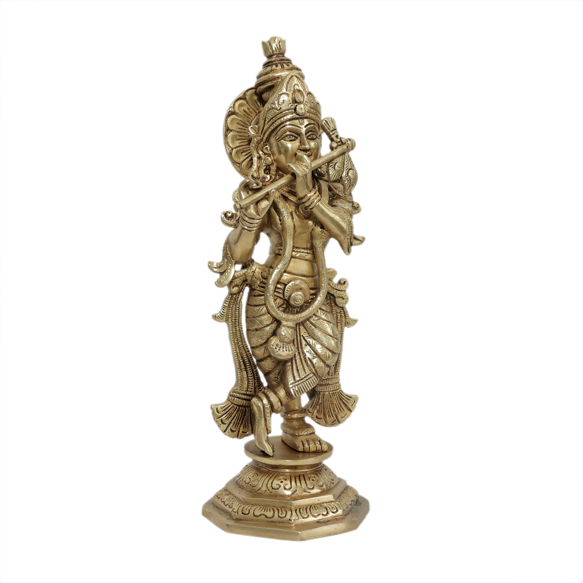 Invite Lord Krishna's divine presence into your home with this beautiful brass Krishna murti featuring exquisite craftsmanship and golden finish. This medium-sized statue perfectly captures Shri Krishna's enchanting form with detailed artistic work that brings spiritual energy to any space.