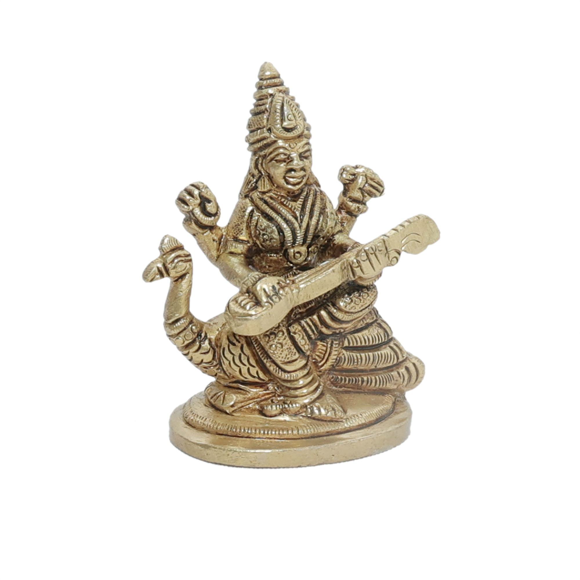 Invite Goddess Saraswati's divine blessings of knowledge and wisdom with this miniature brass murti crafted in golden finish. Perfect for study tables, office desks, and small puja corners, this beautiful Saraswati mata idol brings academic success and creative inspiration to students and professionals.