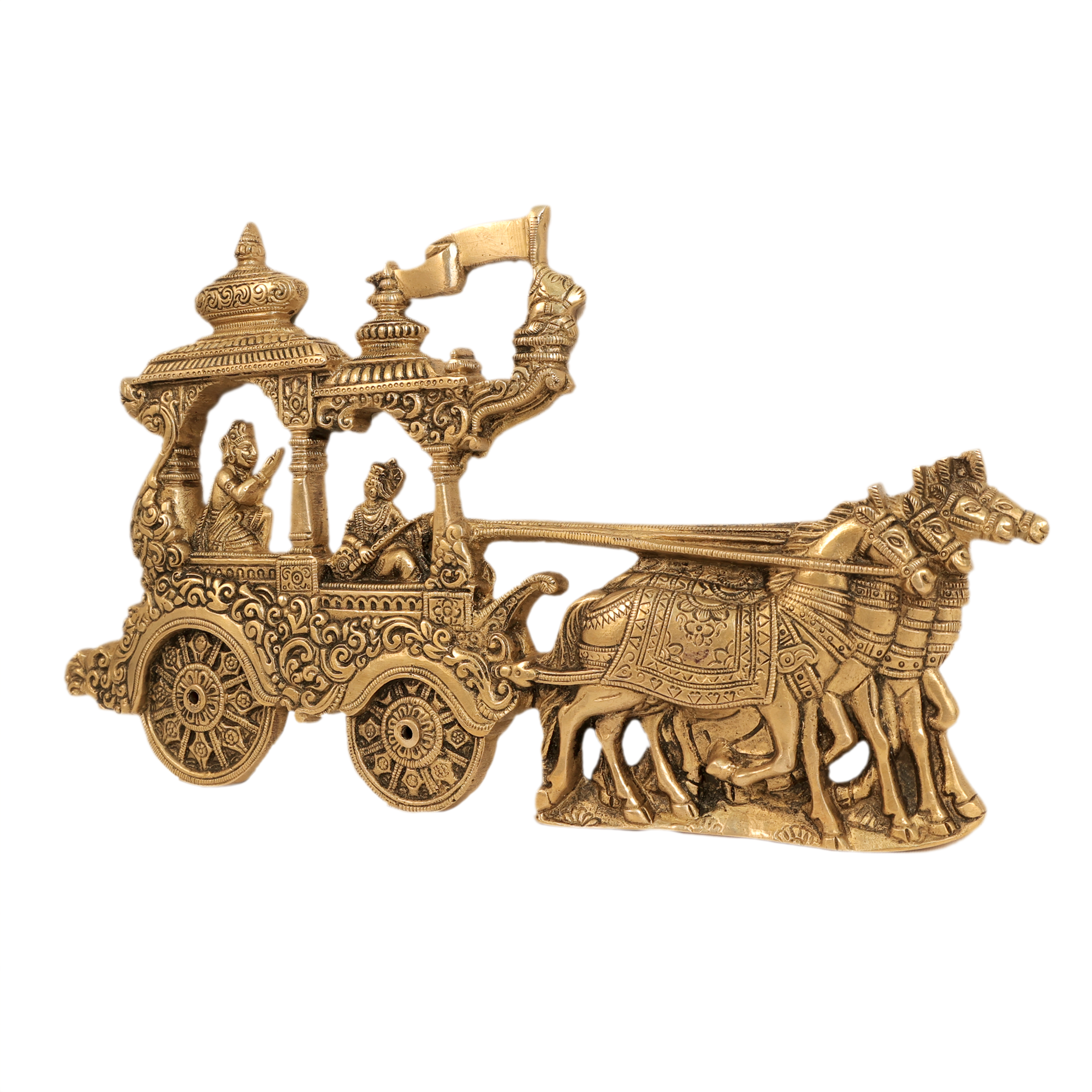 Intricate Brass Craftsmanship: Finely handcrafted brass chariot with Arjun and Shri Krishna, radiating divine charm.