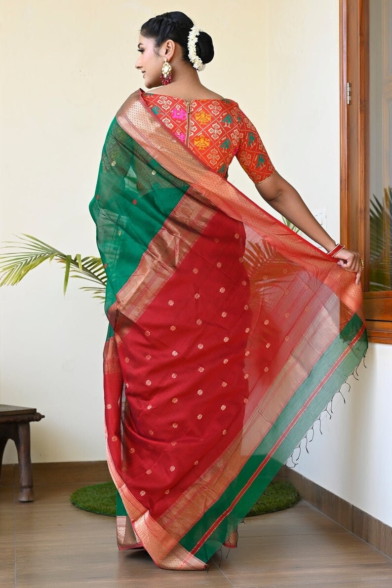 The Maheshwari Handloom Saree with Khatiya Zari Border and Buti Work is a stunning piece that beautifully showcases traditional craftsmanship. Crafted from premium handwoven fabric, this saree features intricate Khatiya Zari borders that add a touch of elegance and sophistication to the overall design. The delicate buti work, scattered across the saree, enhances its timeless appeal with its subtle yet intricate motifs.