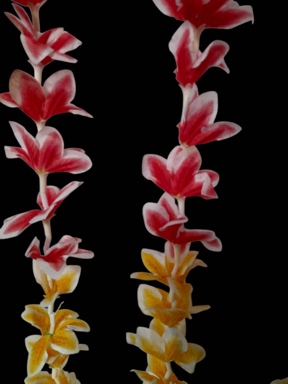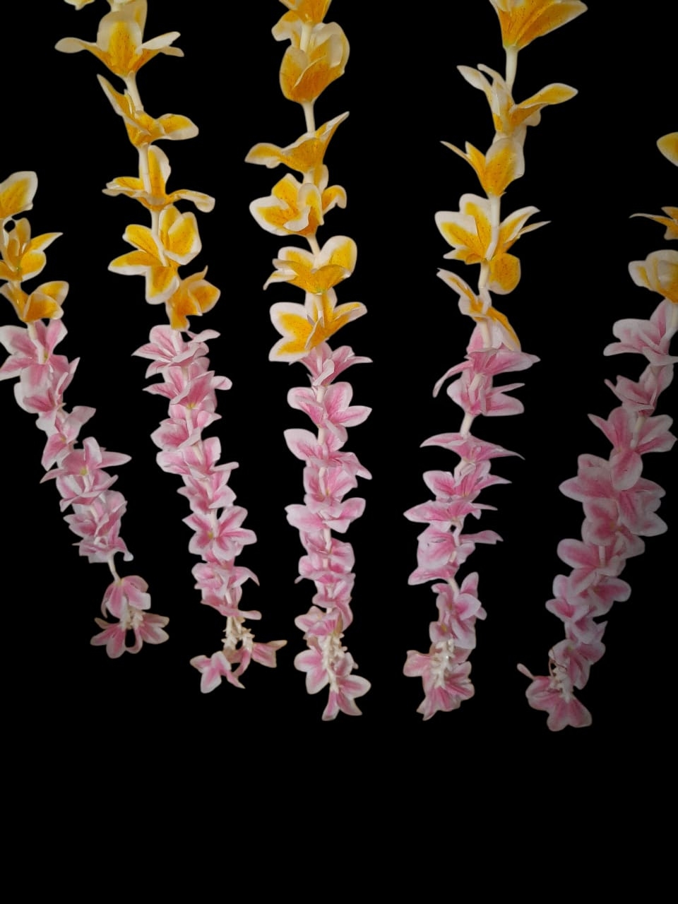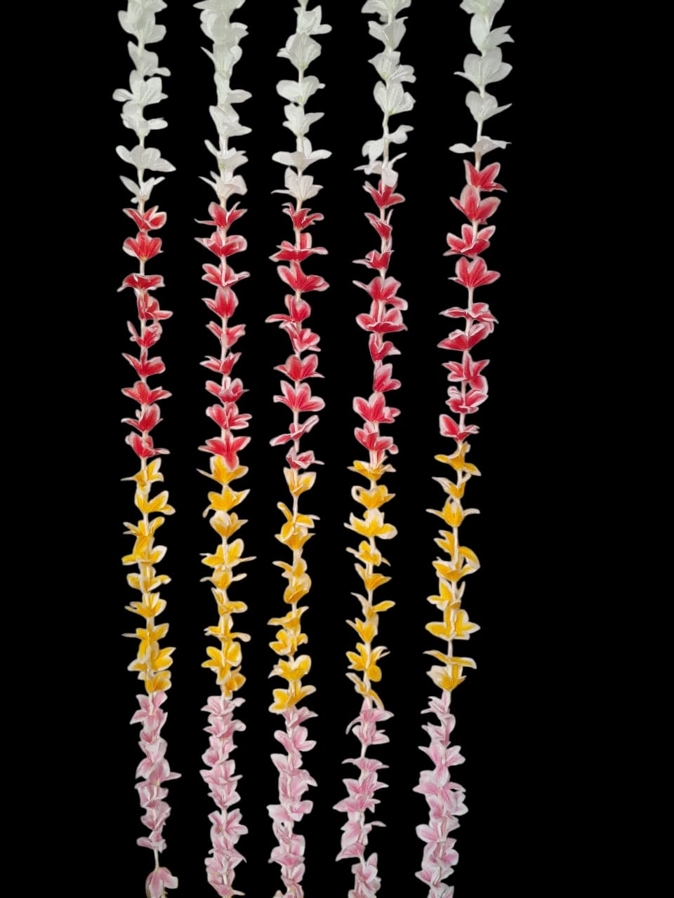 the product consists of artificial flower garlands, desingned for decorative purposes often used as hanging or torans.