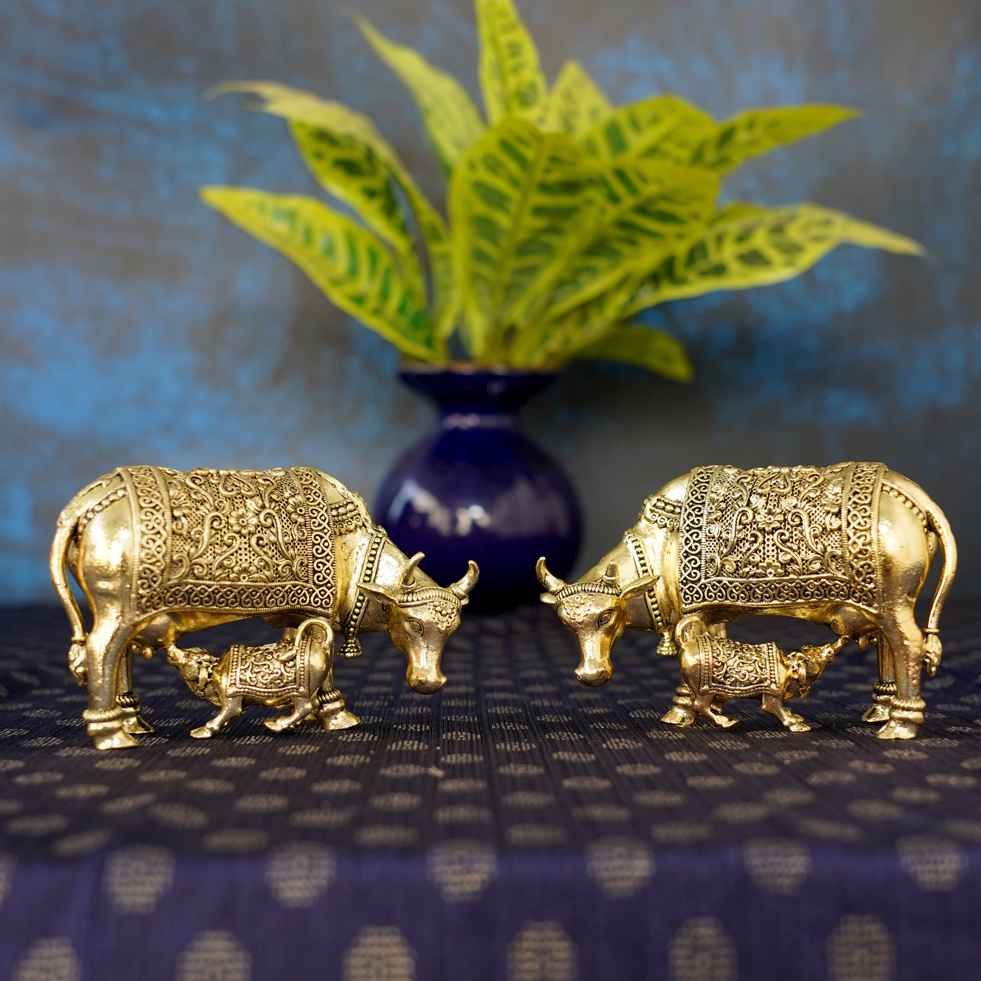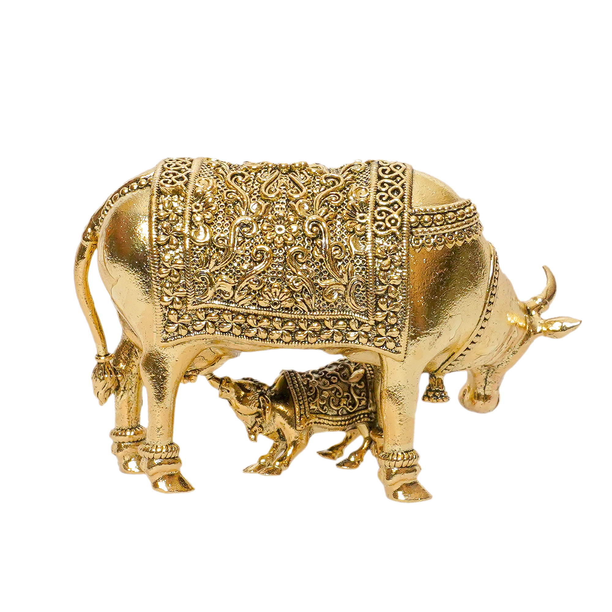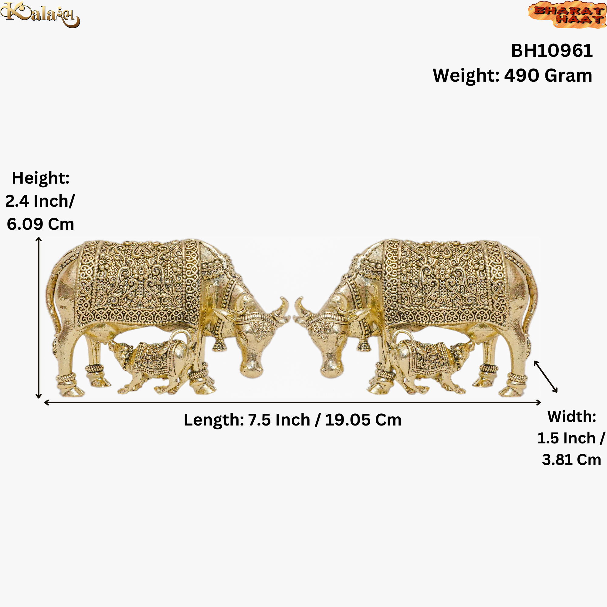 Brass Cow & Calf | Handcrafted Brass Cow and Calf Figurine Set for Home Décor & Pooja (7.5 x 1.5 x 2.4 Inch, 490 Gram, 2 Pcs), This exquisite Brass Cow & Calf figurine set is a beautifully handcrafted representation of the nurturing bond between a cow and her calf. Made from premium quality brass, these idols showcase intricate detailing, making them a perfect blend of spirituality, culture, and décor.