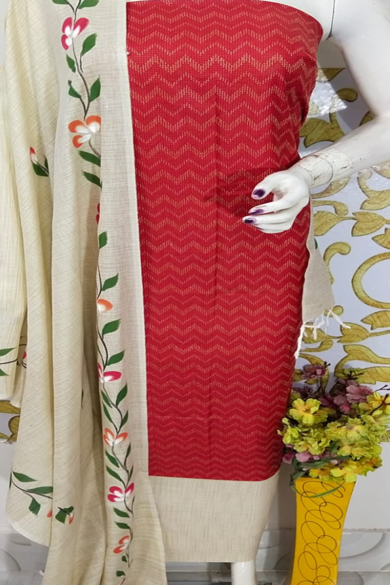 Add a touch of sophistication to your ethnic wardrobe with this 3-piece unstitched suit material set. The top is crafted from premium viscose silk featuring intricate weaving work, paired with a khadi cotton bottom for comfort and durability. The look is completed with a khadi cotton dupatta adorned with screen-printed designs, giving it a traditional yet modern appeal. Perfect for festivals, parties, and daily ethnic wear, this suit piece set is a blend of elegance and versatility.