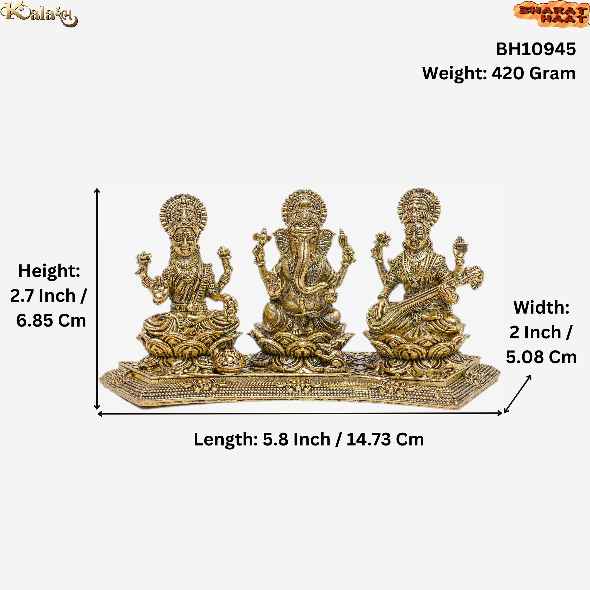 Brass Ganesha, Lakshmi & Saraswati Idol – Handcrafted Trio Deity Statue, 420g, Invite divine blessings of wisdom, wealth, and knowledge with this beautifully handcrafted Brass Ganesha, Lakshmi & Saraswati idol. Lord Ganesha removes obstacles and brings success, Goddess Lakshmi blesses with prosperity and abundance, and Goddess Saraswati enhances knowledge and creativity.