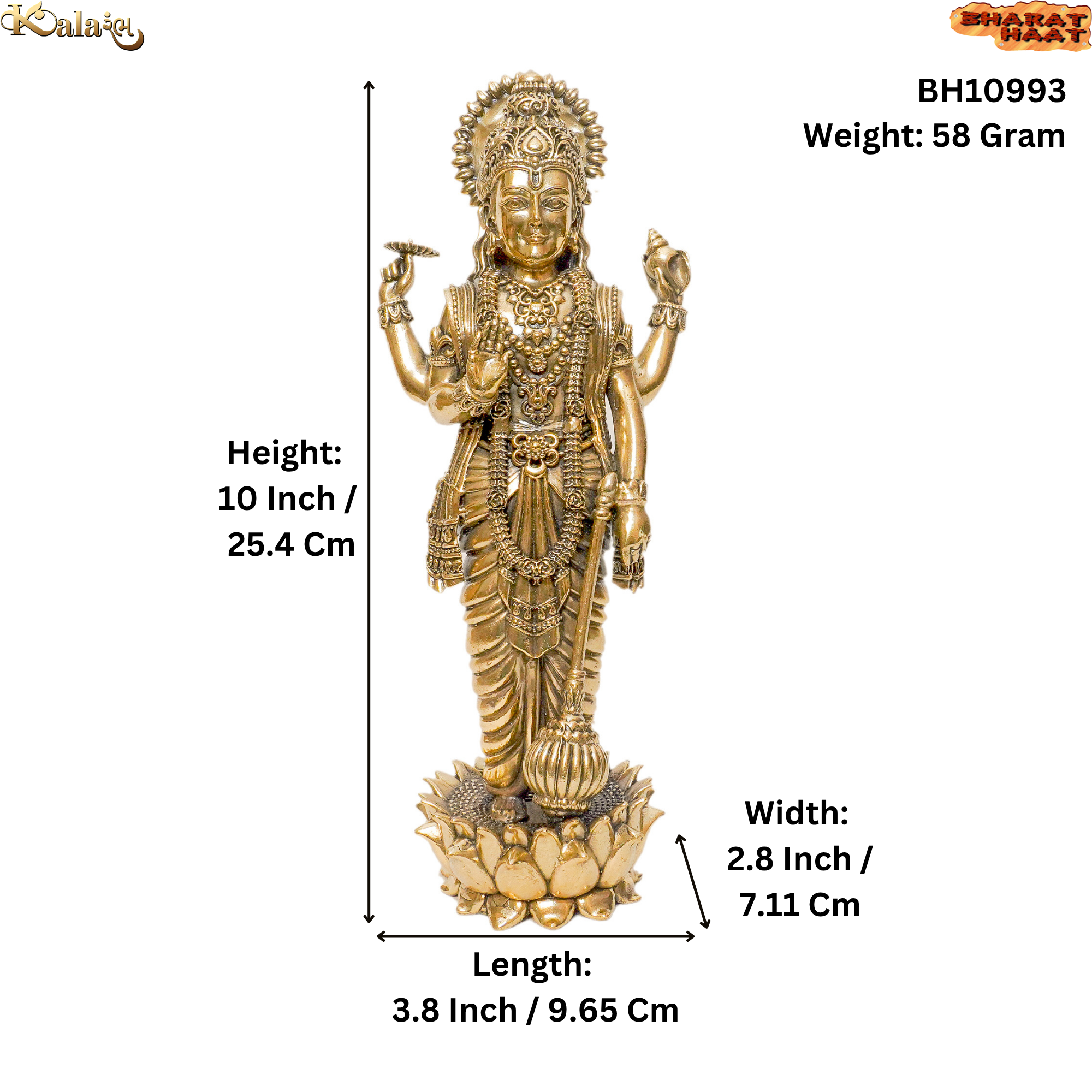 Expertly crafted in pure brass with intricate detailing, this idol stands tall with dimensions of 3.8 x 2.8 x 10 inches (9.65 x 7.11 x 25.4 cm) and a weight of 800 grams. Its elegant finish and detailed features make it not only a spiritual centerpiece but also a timeless piece of décor.
